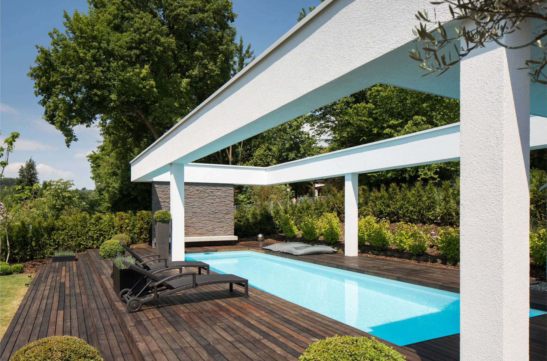 Ein 13 Meter langer verputzter Rahmen umspannt den Poolbereich. „Das verleiht dem Haus gute Proportionen. Durch einen Anbau auf der anderen Seite des Hauses sieht es so aus, als würde das Haus zwei Arme ausstrecken“, sagt Philipp.
