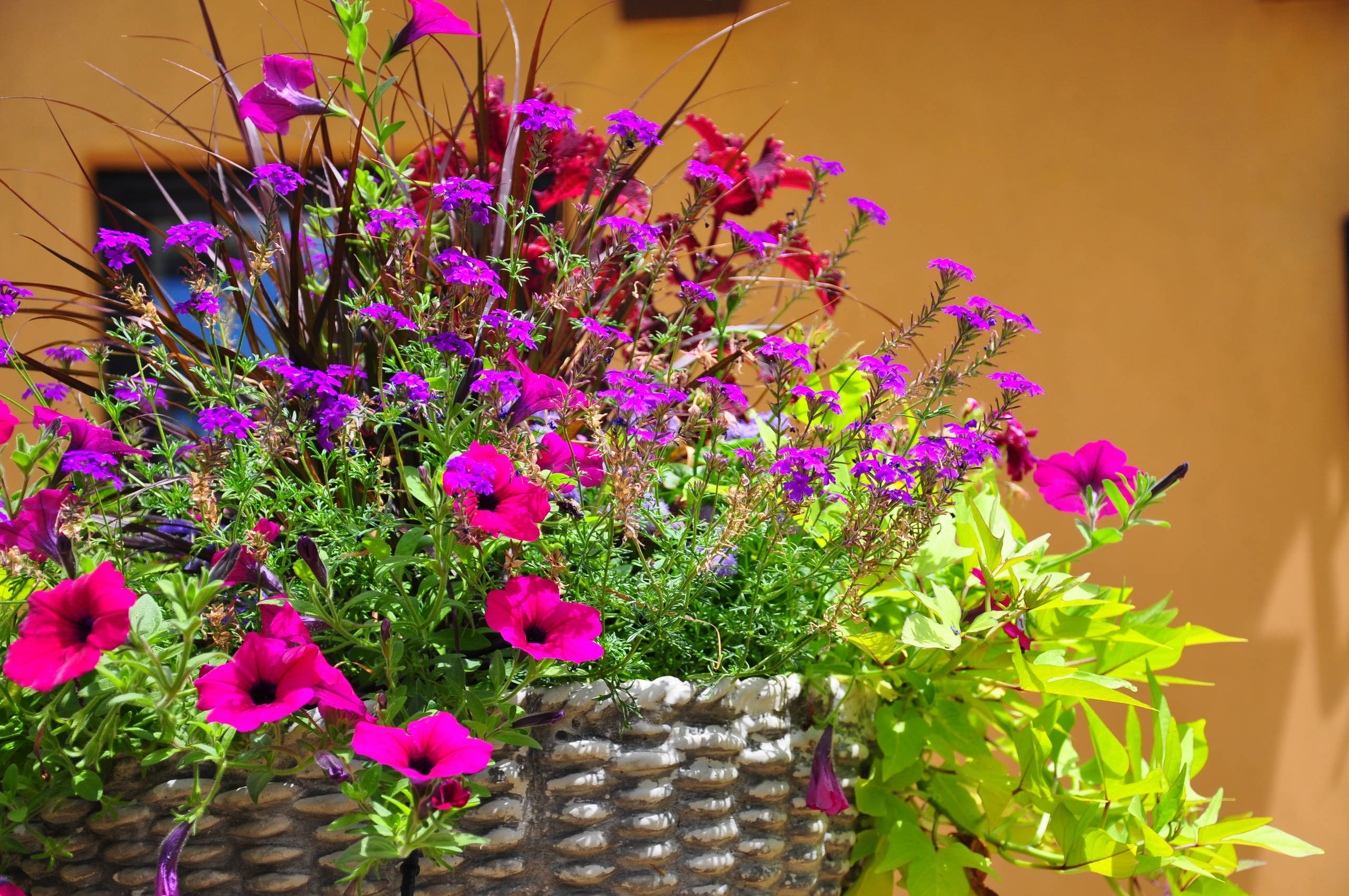 Hier blühen Petunie, Buntnessel, Rotes Lamenputzergras Pennisetum setaceum, z.B. die Sorte ‘Fireworks’