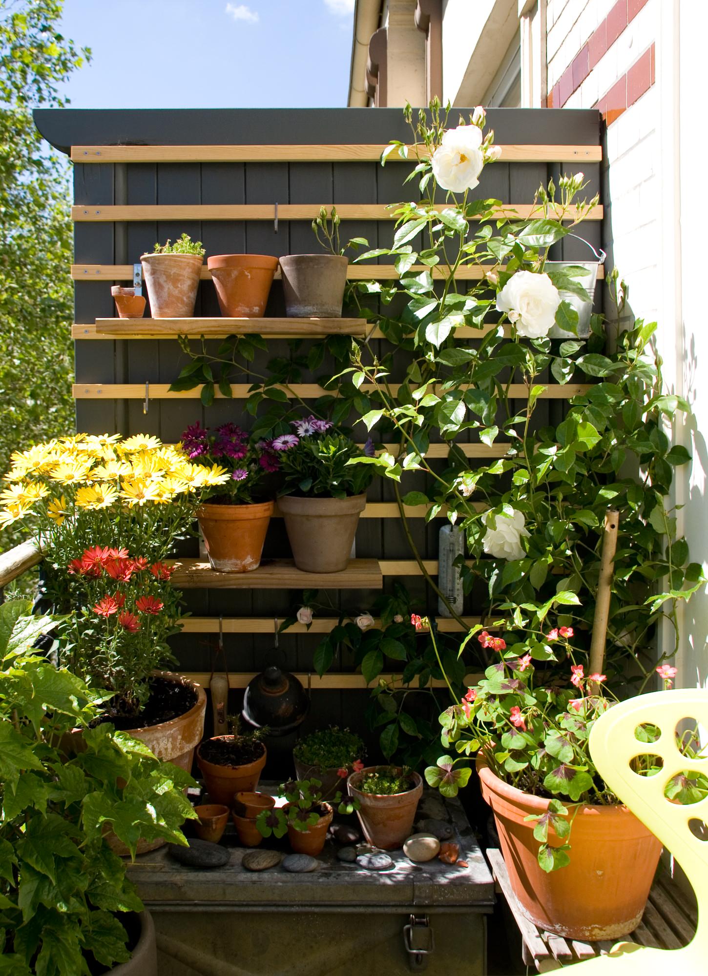 Vertikales Gärtnern eignet sich vorwiegend auf kleinen Balkonen! Mit Regalen, Pflanzwänden oder auch Kletterpflanzen geht die Gestaltung in die Höhe statt in die Breite – ideal für einen kleinen Balkon. Besonders manche Rosen, Clematis und die nicht winterharten Schlinger Schwarzäugige Susanne und Kaputzinerkresse eignen sich.