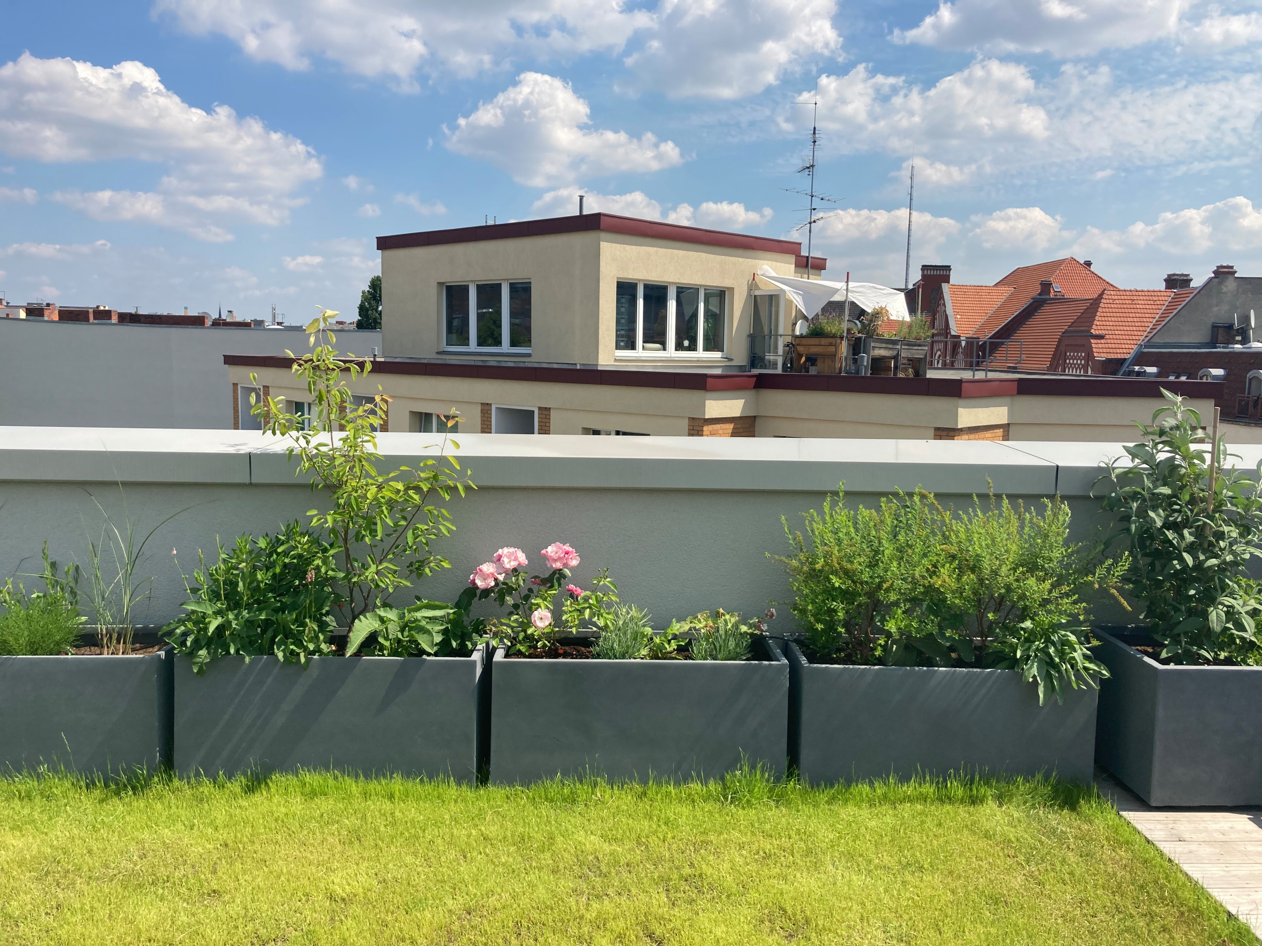 Diese Dachterrasse in Hamburg hat Aniela Horntrich von Nelka mit Stauden und Reitgras üppig bepflanzt.