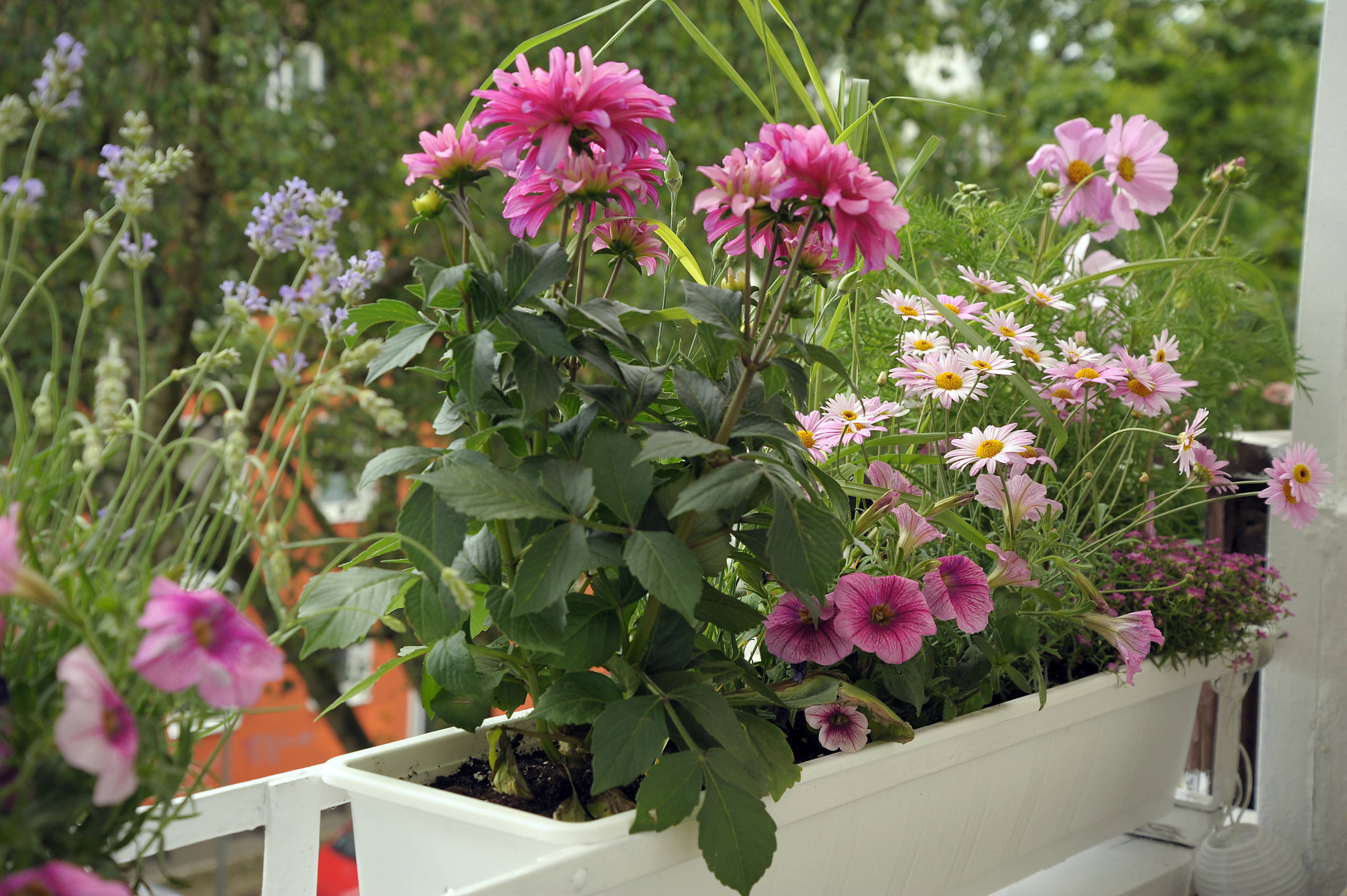 In diesen Balkonkästen wachsen unter anderem Dahlien, Petunien und Schmuckkörbchen.
