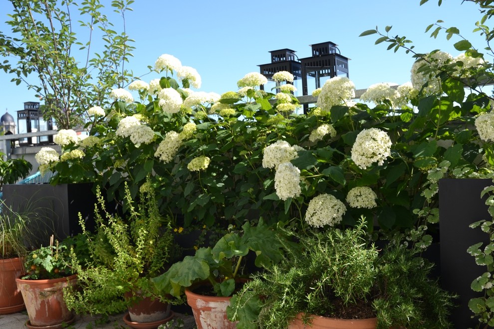 In diesem Beispiel kommen unter anderem verschiedene Kräuter und Hortensien zum Einsatz.