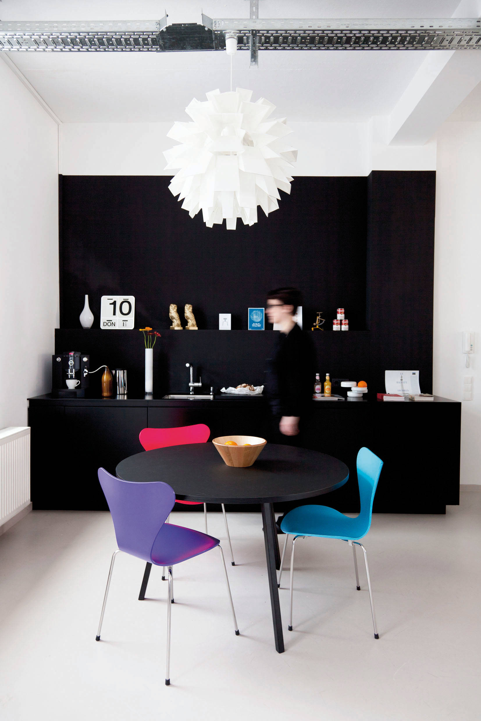 Der simultane Helligkeitskontrast bezieht sich auf eine Farbe, die in der Umgebung einer dunklen Fläche hell wirkt und im Vergleich dazu vor hellem Hintergrund dunkler erscheint. In diesem Küchenprojekt ist das Phänomen an den Stühlen in Hinsicht auf das Schwarz der Küche und das Weiß im Hintergrund genau zu beobachten.