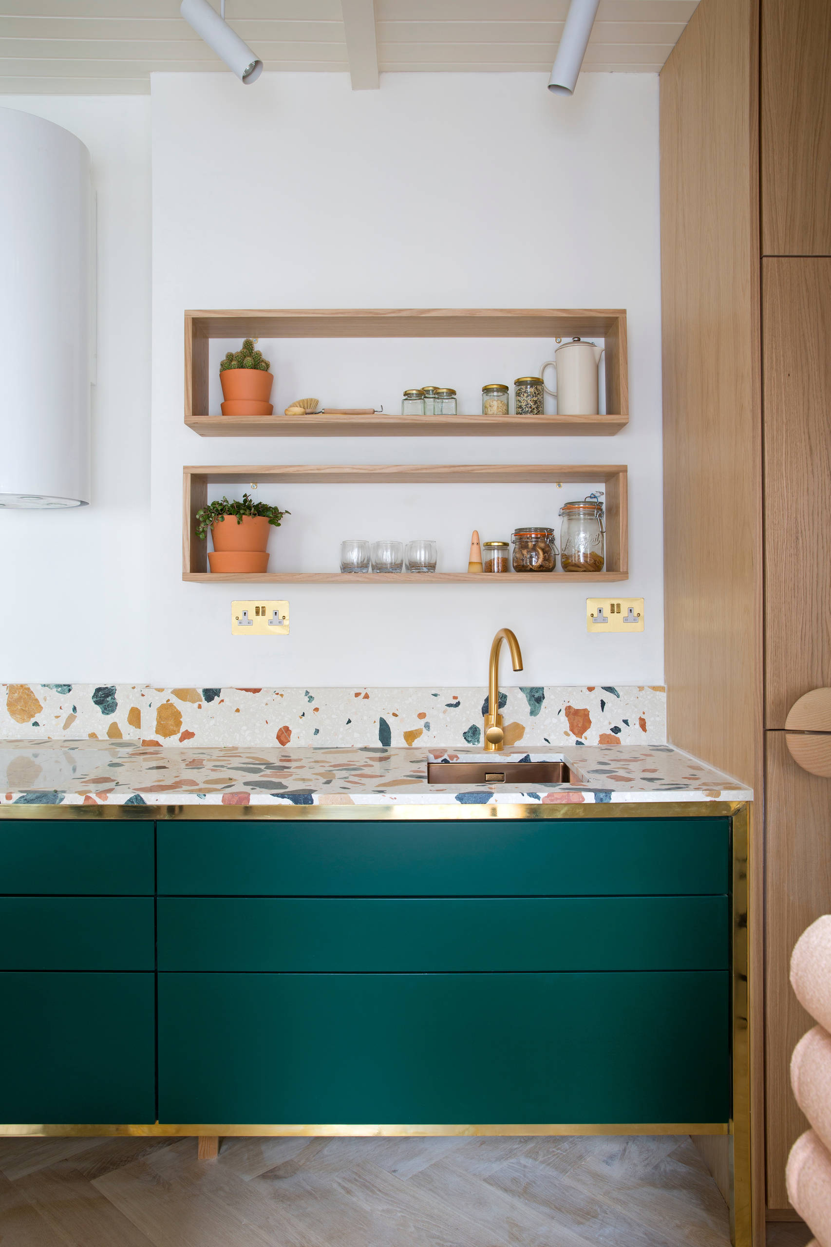 Das seit Jahrtausenden bekannte Materialgemisch mit seiner typischen Optik erlebt gerade einen echten Hype im Interieur. Nicht nur auf Böden, sondern auch in immer mehr Küchen (und Badezimmern). Dieses traditionelle Material wird oft als Alternative zu Marmor oder Granit verwendet. Tatsächlich enthält der Verbundwerkstoff Marmorsplitter, die in Zement oder Harz eingebettet und anschließend poliert werden. Es ist extrem strapazierfähig und kann je nach Farbe und Größe der verwendeten Späne stark variieren. Bei Terrazzo können – ähnlich wie bei Beton – Arbeitsfläche und Spüle aus einem Guss gefertigt werden. Mittlerweile bietet der Handel, wie zum Beispiel der Hersteller Lechner, auch Oberflächen im Terrazzolook aus Keramikwerkstoff.