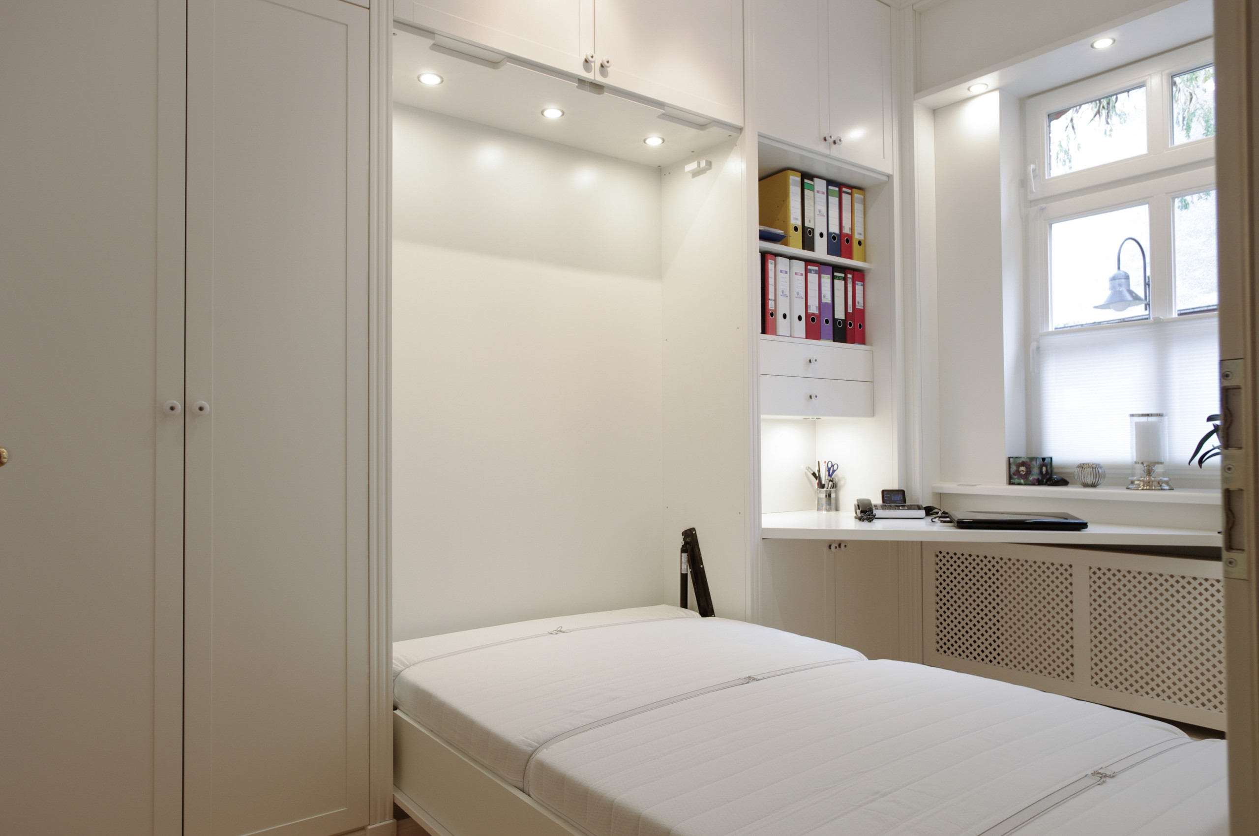 Die Überlegung: Ein Schrankbett ist die ideale Lösung, wenn Sie ein gemeinsames Arbeits- und Gästezimmer einrichten möchten oder ihnen einfach generell der Platz für ein separates Gästezimmer fehlt.