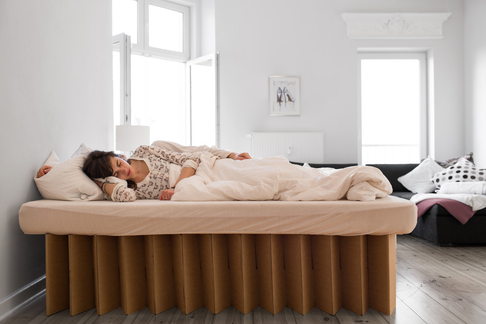 Die junge Berliner Marke Room in a box hat etwa ein Bett aus Wellpappe entwickelt, das sich wie eine Ziehharmonika auf- und zuschieben lässt. Ganz zusammengeschoben hat es die handlichen Maße von 160 x 30 x 20/40 cm. Es besteht zu 85 Prozent aus recycelten Rohstoffen. Das Bett ist aufgrund der Wellpappenstruktur sehr stabil und kann laut Herstellerangaben bis zu zehn Personen tragen. Weitere Pappmöbel hat auch Stange Design im Angebot – zum Beispiel einen Schreibtisch und Regale.