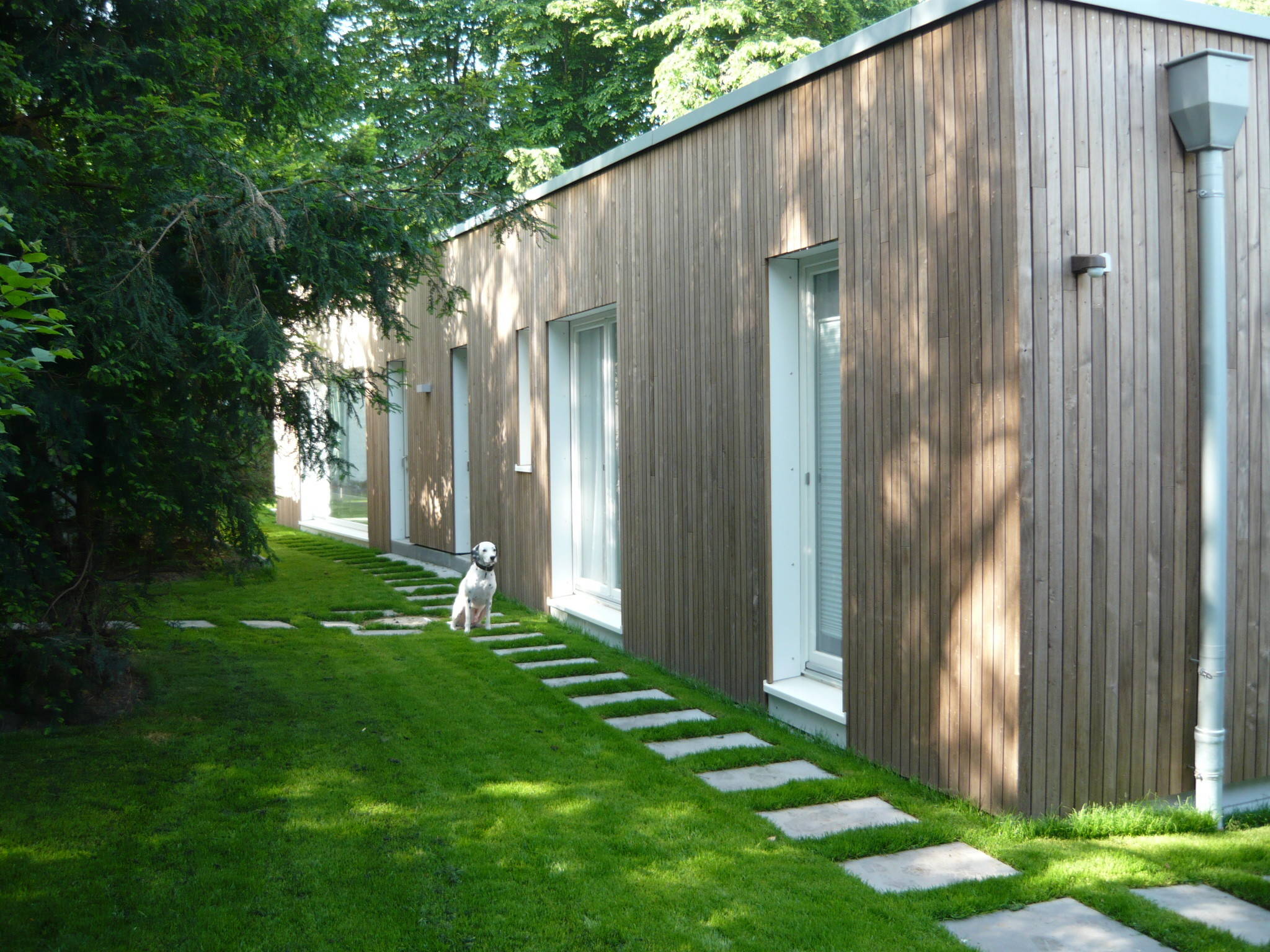 Im großen Garten seines ehemaligen Hauses wünschte sich der Bauherr von Architekt Thomas Dauber ein altersgerechtes Heim. An das Gelände angepasst, sind die Wände sehr unterschiedlich. Daher entschied sich Dauber für eine Massivbauweise aus Mauerwerk: „Eine Holzbauweise wäre in dem Fall nicht sinnvoll gewesen. Um dennoch Holz zu verwenden, haben wir die Fassade mit Espenholz verkleidet.“