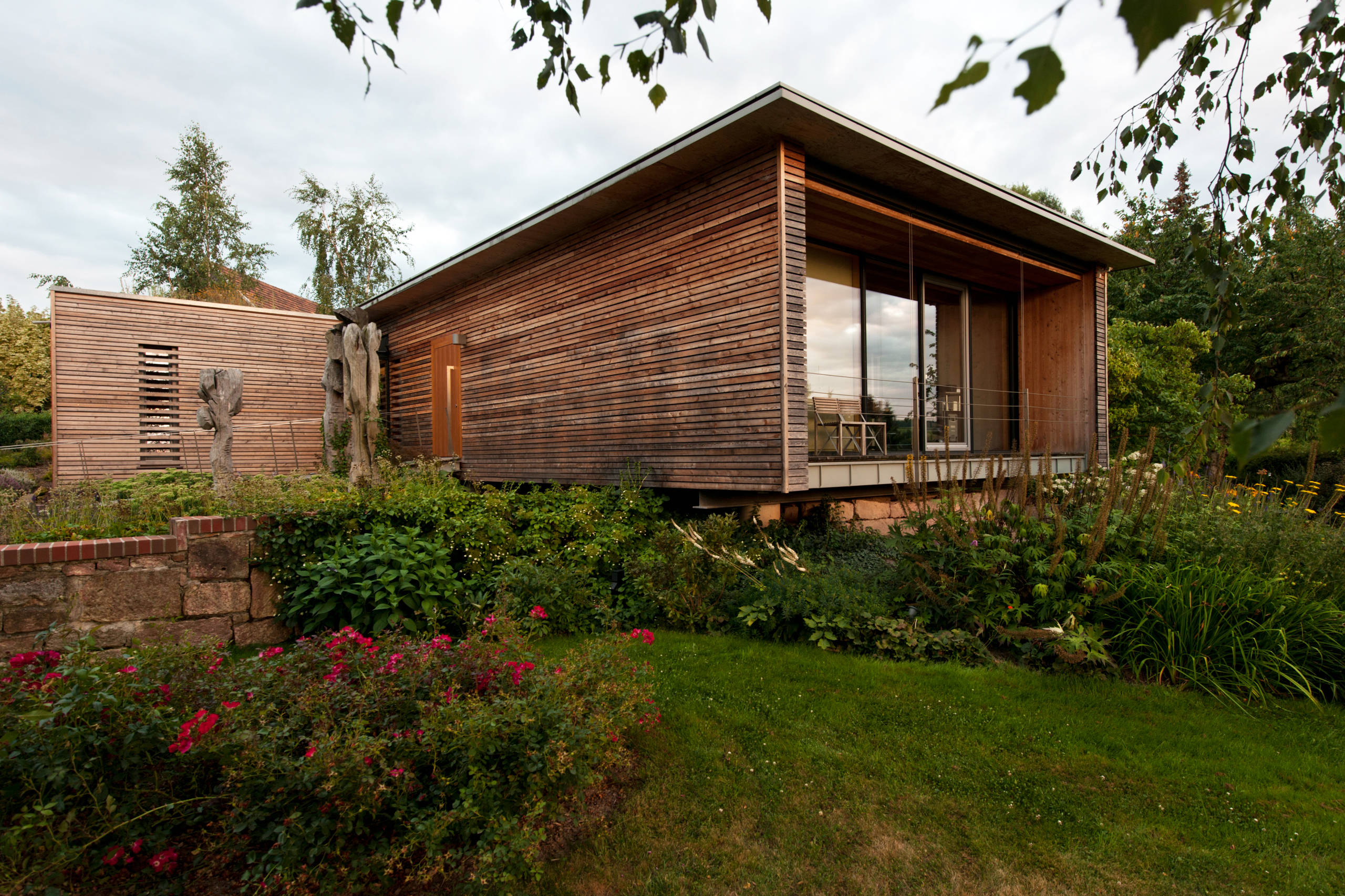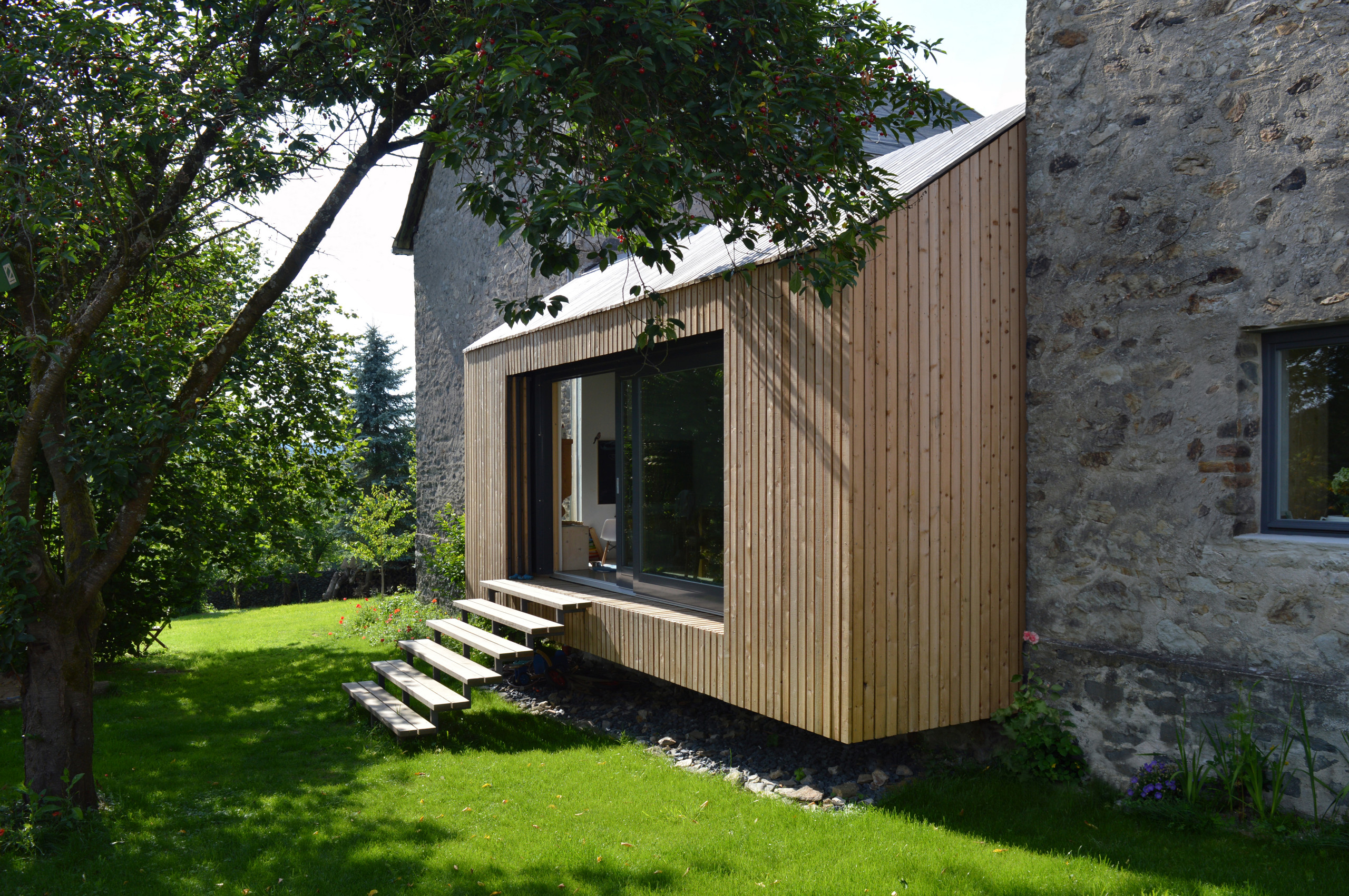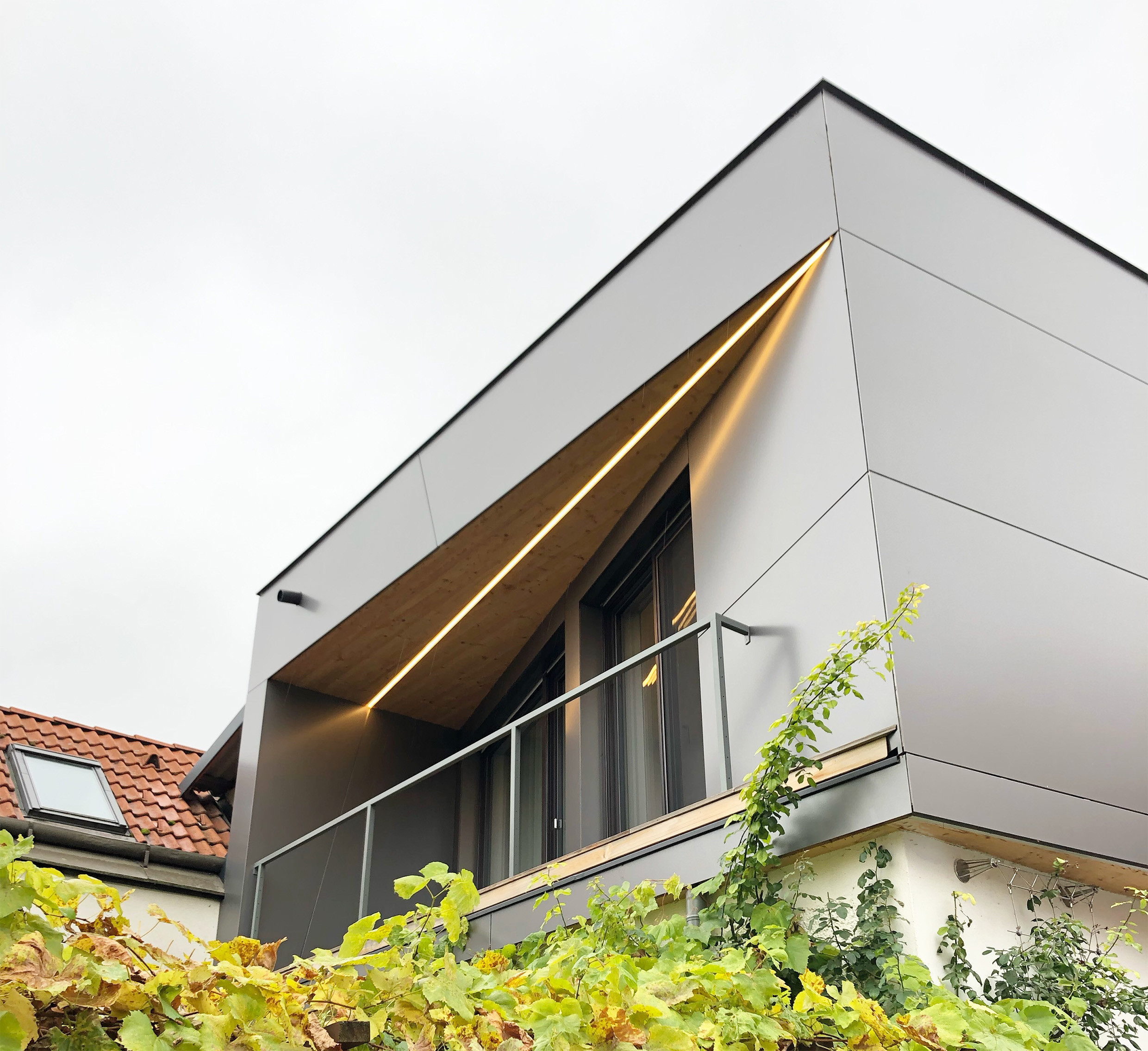 Holzbau sieht nicht immer wie Holzbau aus. Hinter der modernen Metallfassade dieses Anbaus von Arendt & Wendelin verbirgt sich eine Holzriegelkonstruktion.