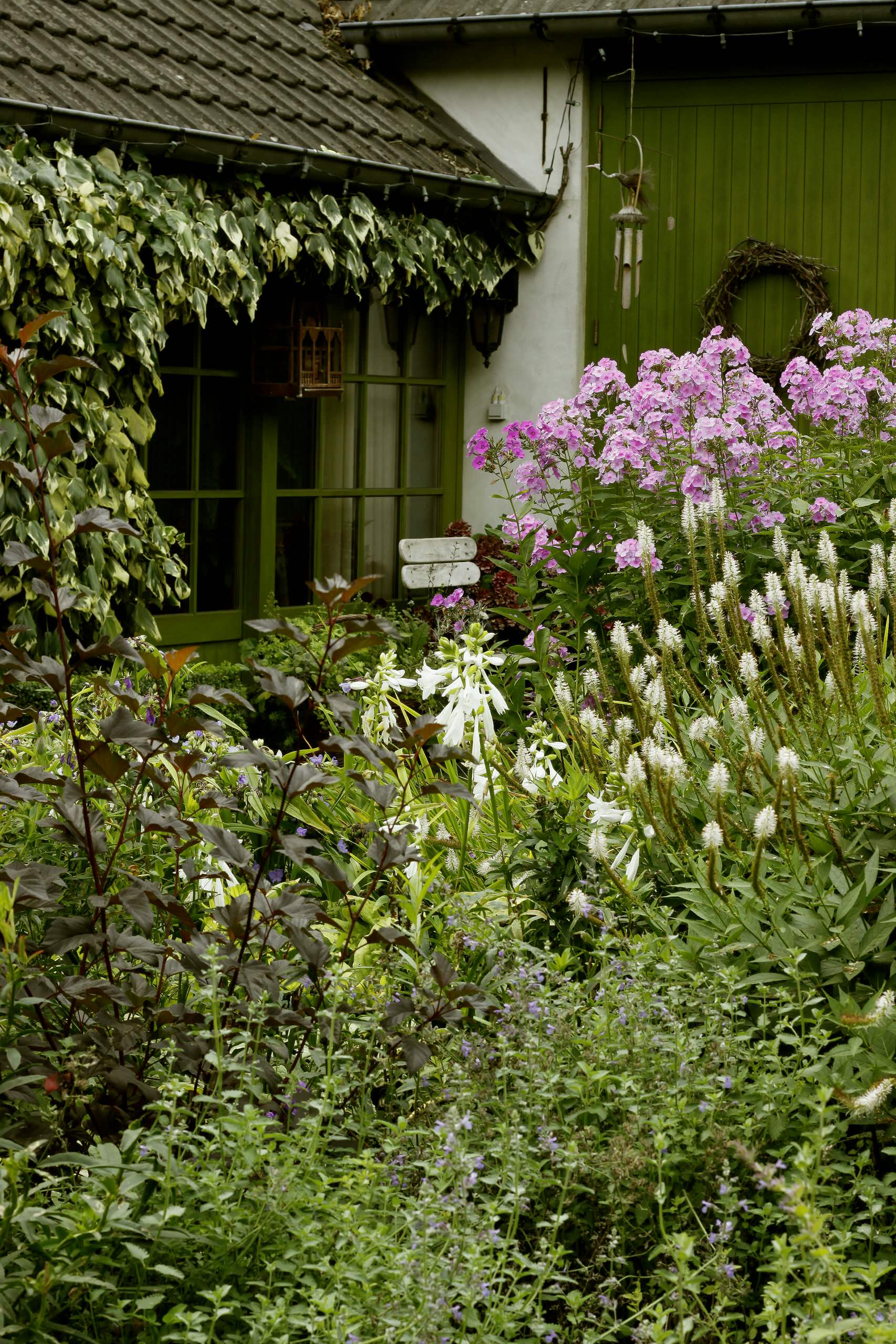 Hinter dem Gästehaus ist der Garten ein wenig wilder. Frauenmantel säumt die Hauswand, während die üppigen, weißen Lilien ein echter Eyecatcher sind. Ihr schwerer, betörender Geruch begleitet den Besucher bis zum Teich.