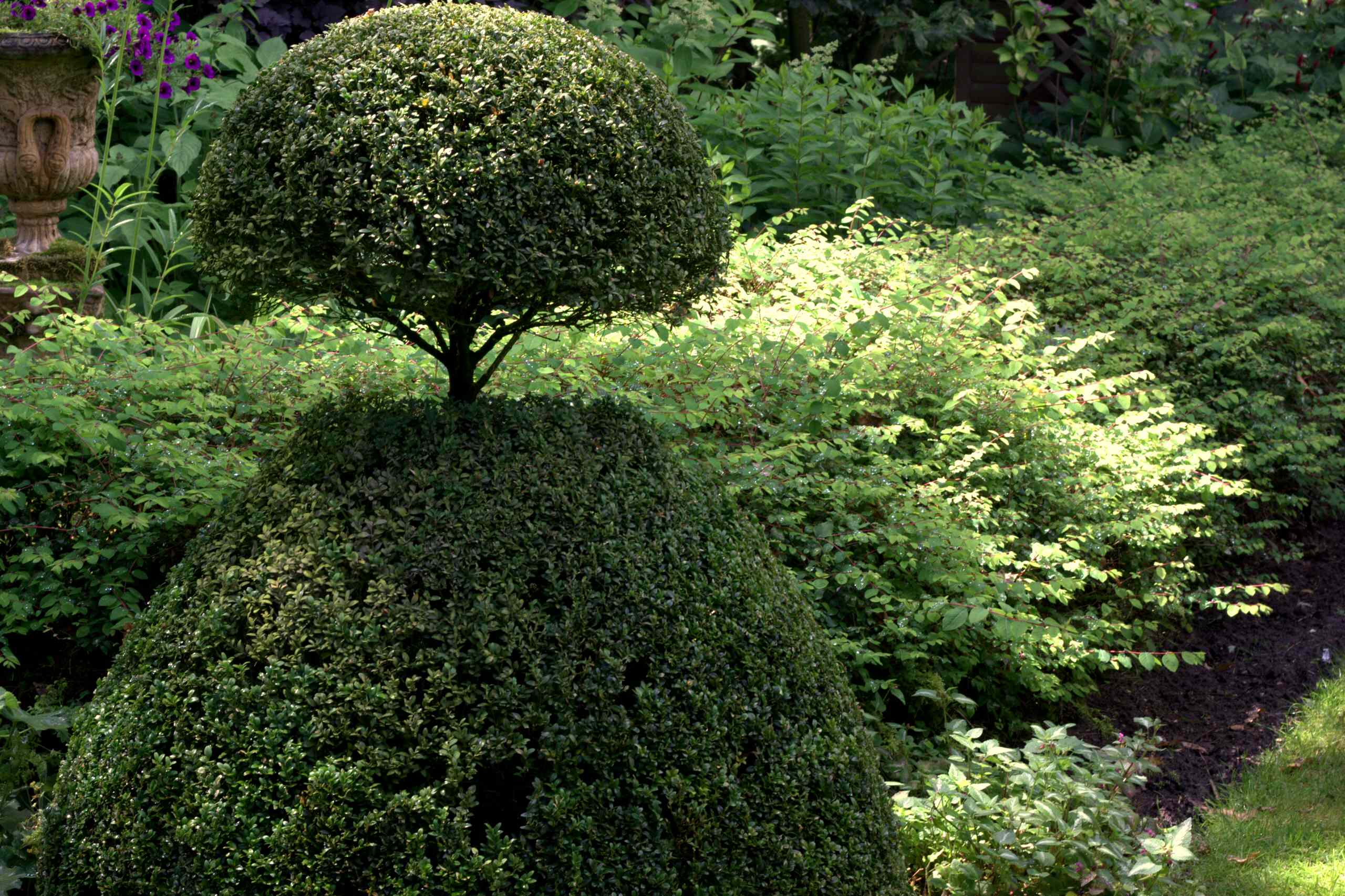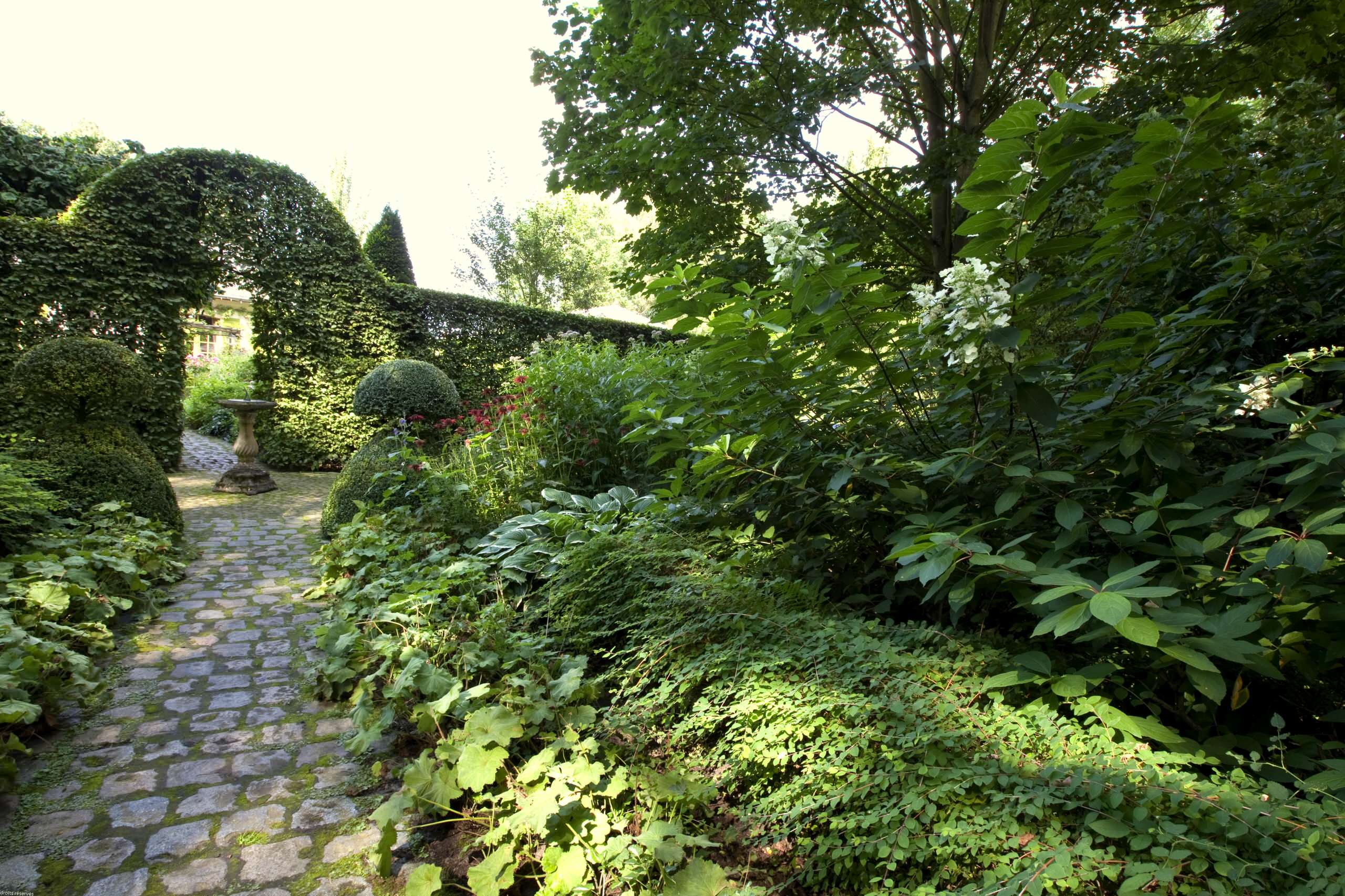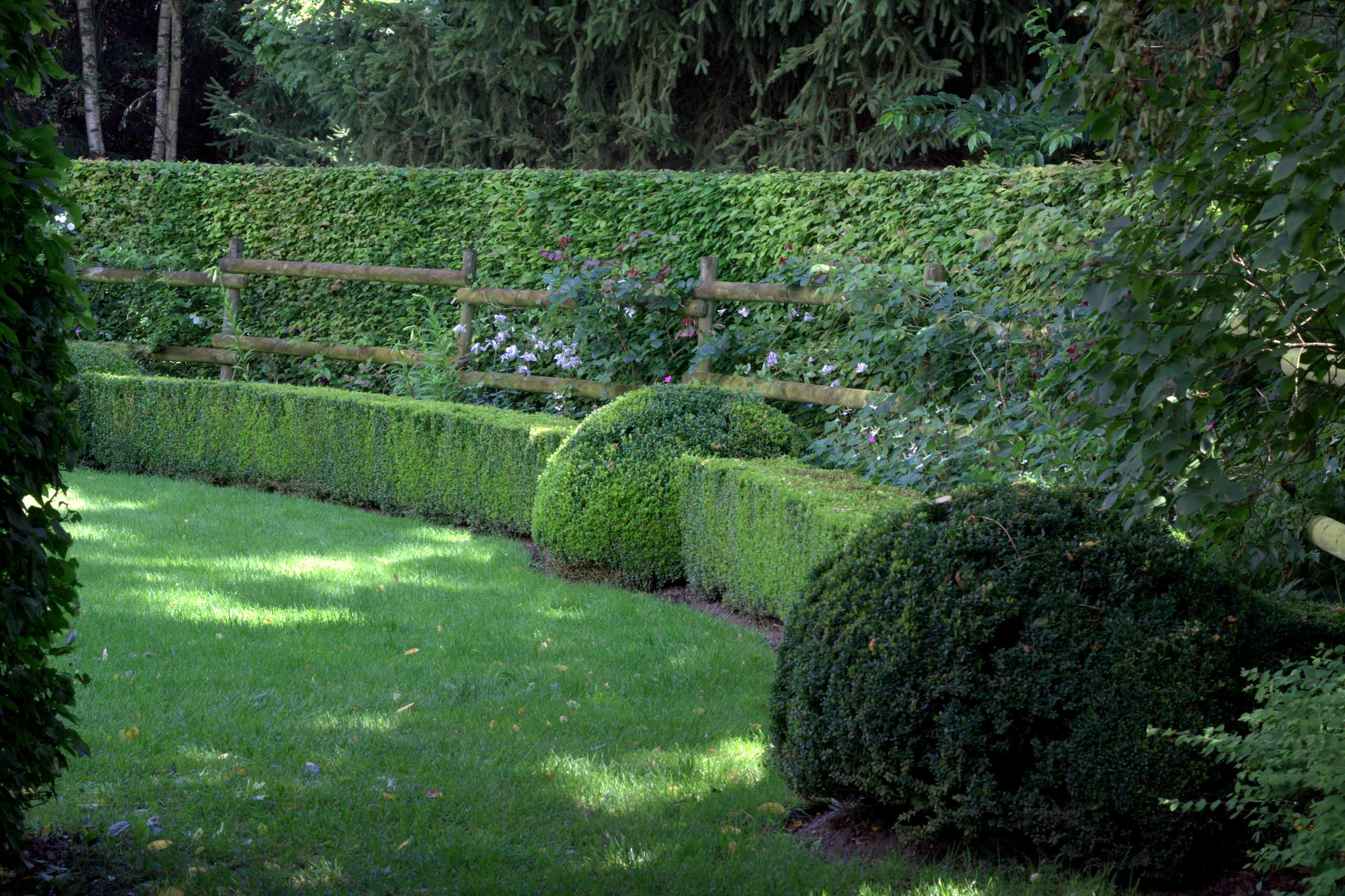 Die teilweise über zwanzig Jahre alten Bäume, vor allem Eibe und Buchs, eignen sich hervorragend für den Formschnitt. Inmitten von Hecken, die Deferme nur wenig beschneiden lässt, fallen die stark beschnittenen Bäume umso stärker auf und verleihen dem Garten einen Hauch Strenge und Klarheit.