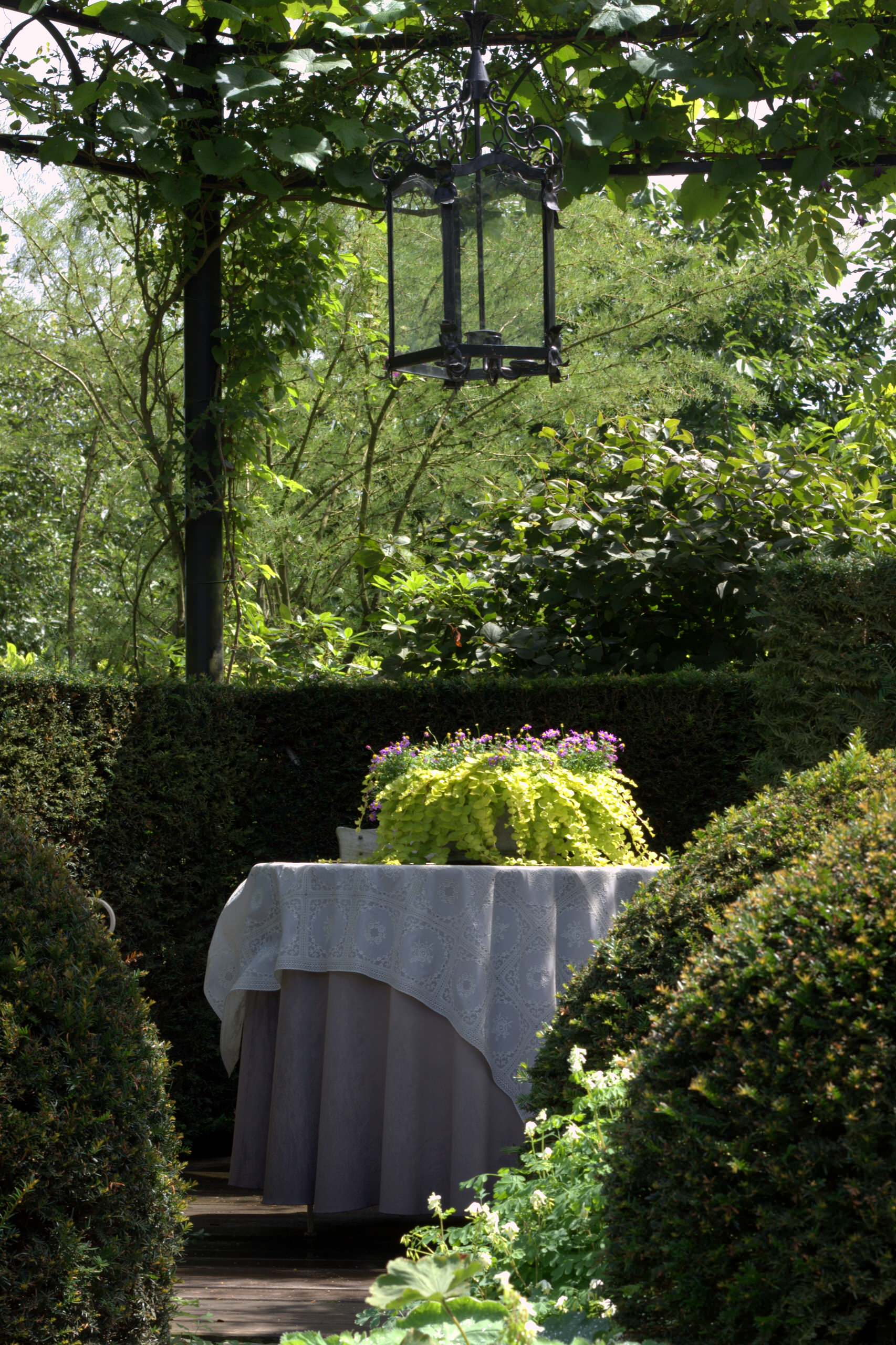 Unter großen Bäumen in der Mitte dieses Gartenbereichs befindet sich im Schutz von Sträuchern und Hecken der große Essplatz. Hier empfängt Deferme gern Gäste und veranstaltet Essen und Grillabende. Dank kurz gehaltenem Buchs und nahegelegenem Bach können die größeren Pflanzen und Bäume ungehindert wachsen und spenden angenehm kühlenden Schatten.