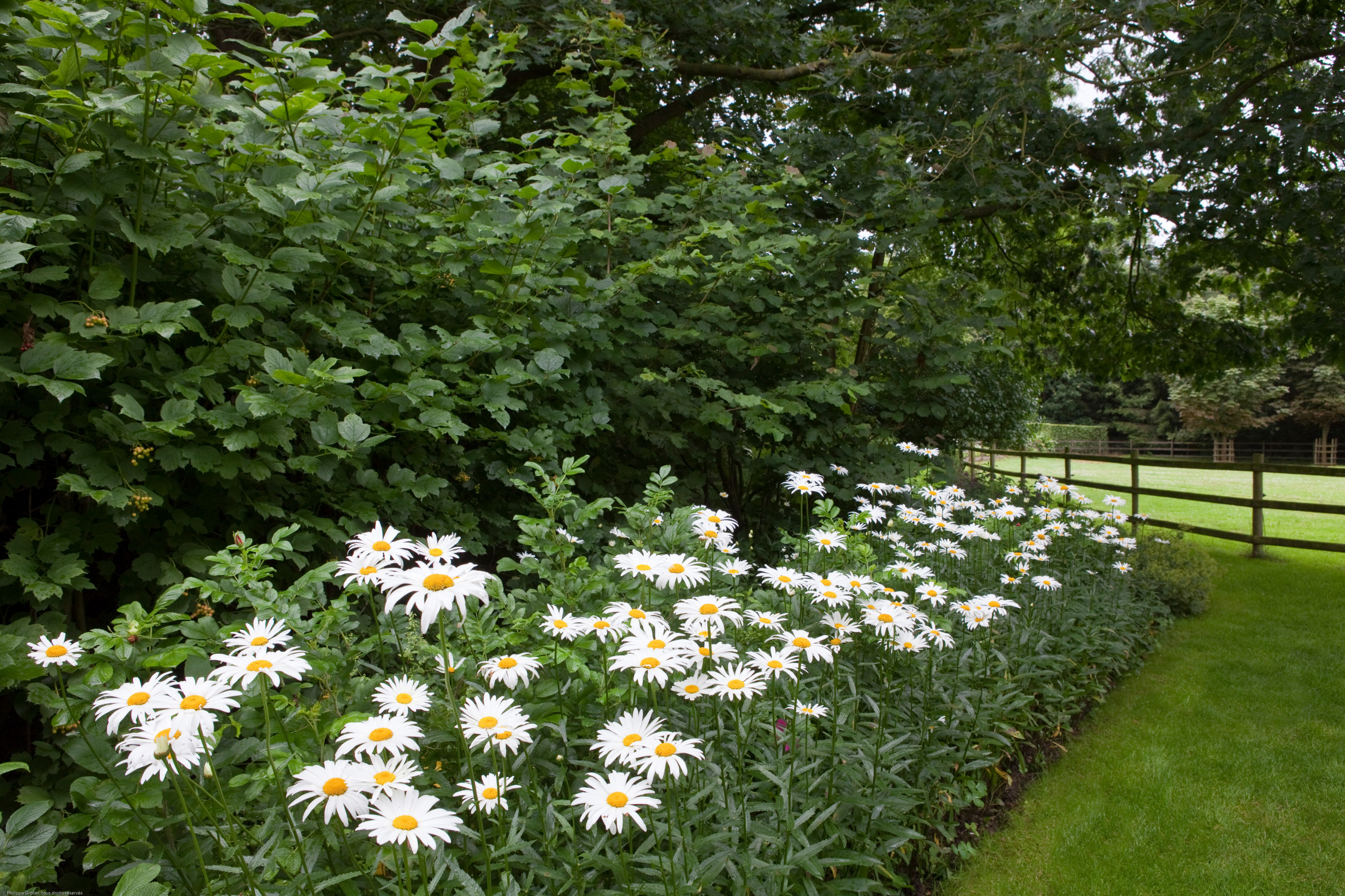 Ein Stück weiter erinnern große Margeriten an die ländliche Umgebung und die nahegelegenen Felder.