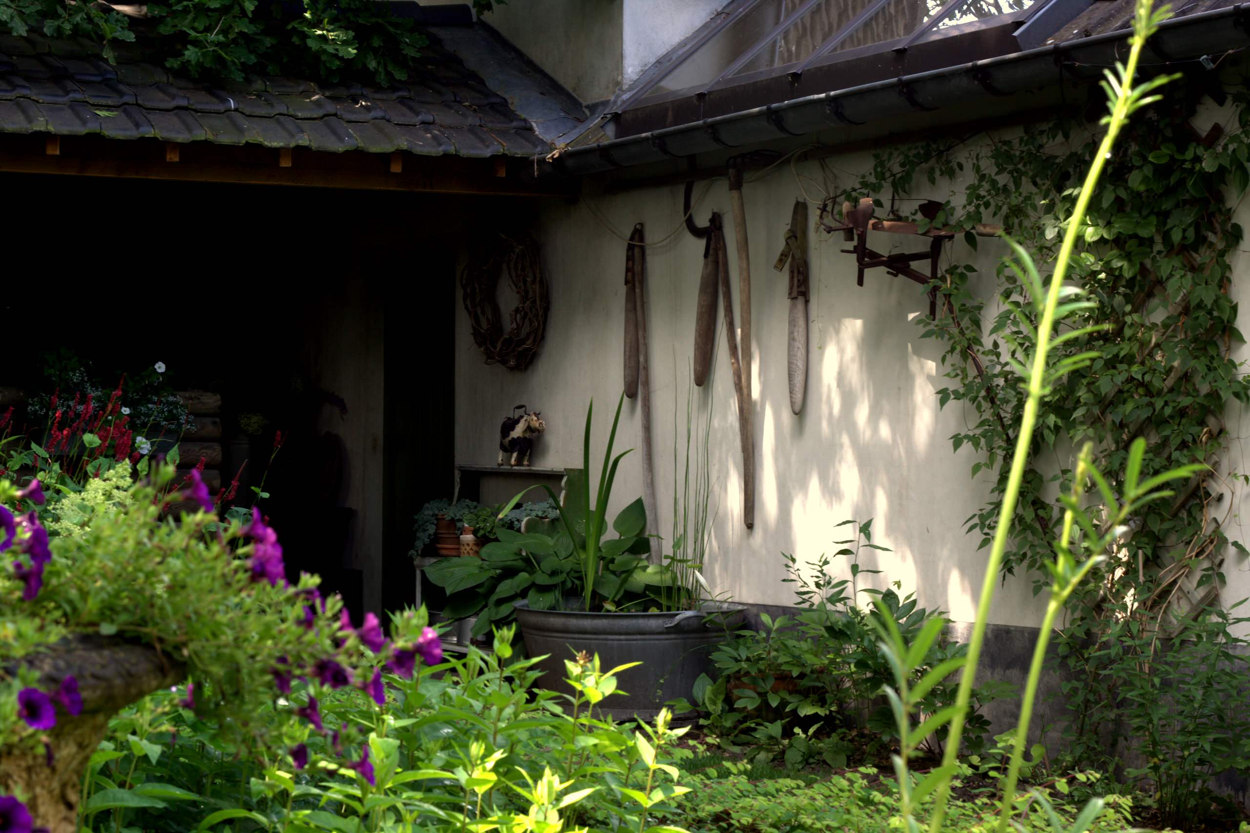 Altes Werkzeug schmückt die Hauswand und erinnert an längst vergangene Zeiten. Von diesem Geräteschuppen aus gelangt man zurück in den Hofgarten.