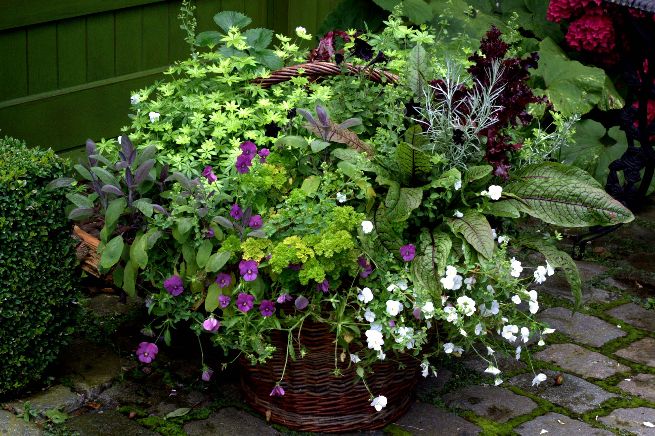 In diesem Korb hat Deferme verschiedene Kräuter wie krause Petersilie, Echten Salbei mit violetten Blättern und Waldmeister mit seinen hübschen sternförmigen Blättern mit Blutampfer, Veilchen, Italienischer Strohblume und einer Erdbeerpflanze kombiniert.