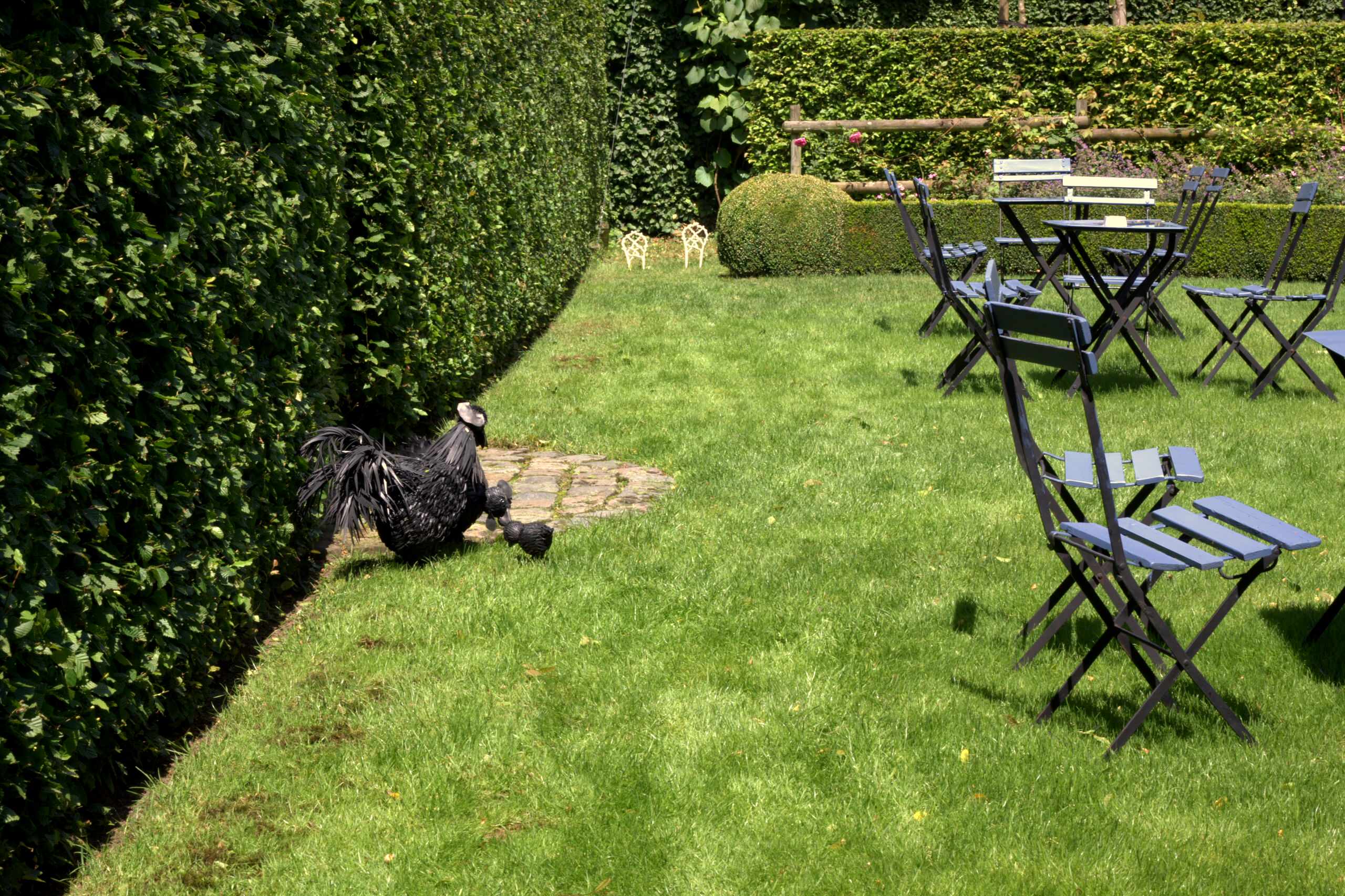Im Garten wird der Besucher von einer Skulpturengruppe aus Henne und Küken begrüßt. Deferme hat auch schon echtes Federvieh gehabt, aber der Fuchs aus dem Wald hat ihm kurzen Prozess gemacht, inklusive des stolzen Hahns! An diesen Vögeln hier wird er sich wohl die Zähne ausbeißen …