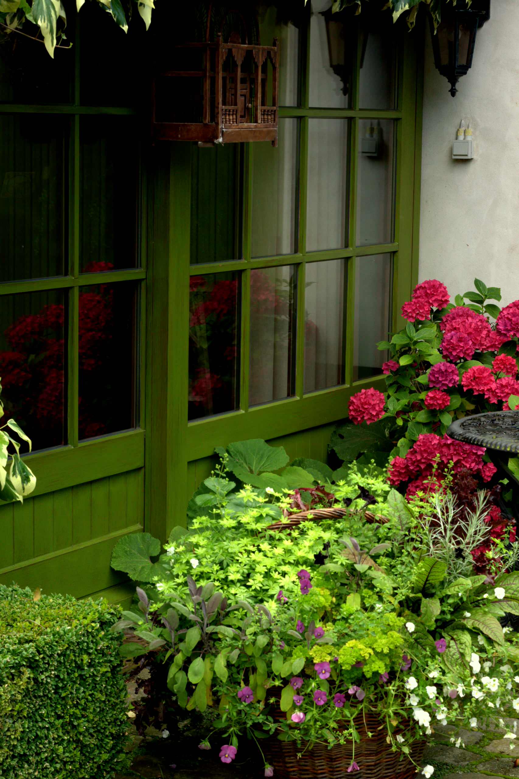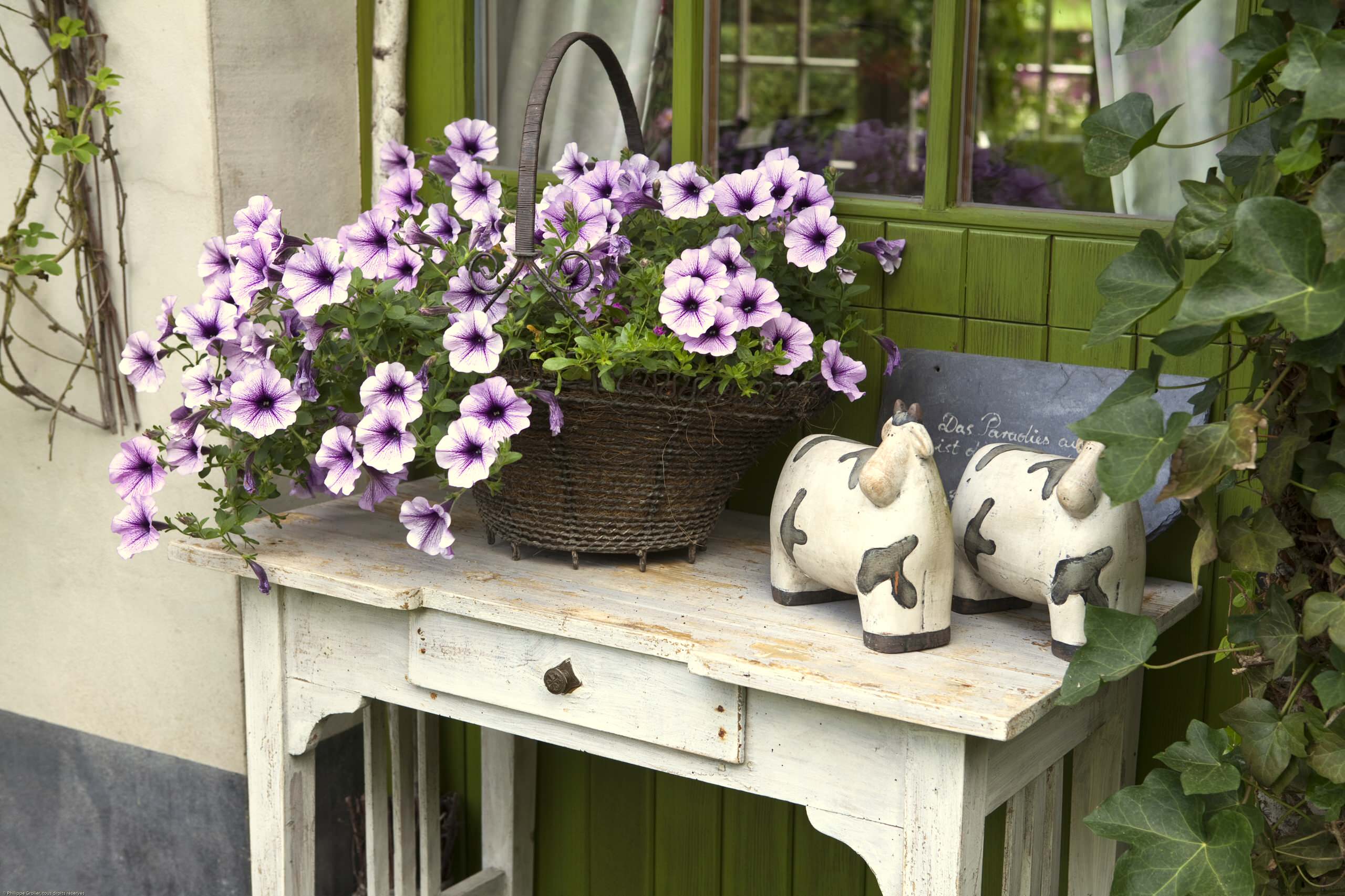 Viele kleine, witzige Accessoires zeugen von Defermes Sinn fürs Detail. Unter den stark blühenden, einjährigen Blumen sind auch jede Menge zweifarbige Petunien zu finden.