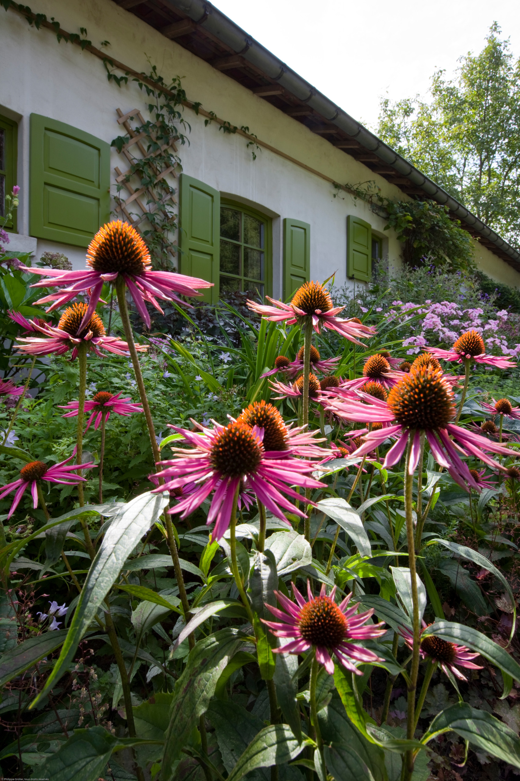 Auch hier der Blick von einem der Beete zu Defermes Büro. Im Blumenmeer geht der gepflasterte Weg beinahe unter. Über weiß blühende Funkien und Punktierten Gilbweiderich ragt prächtiger Phlox empor – üppiger geht’s kaum.