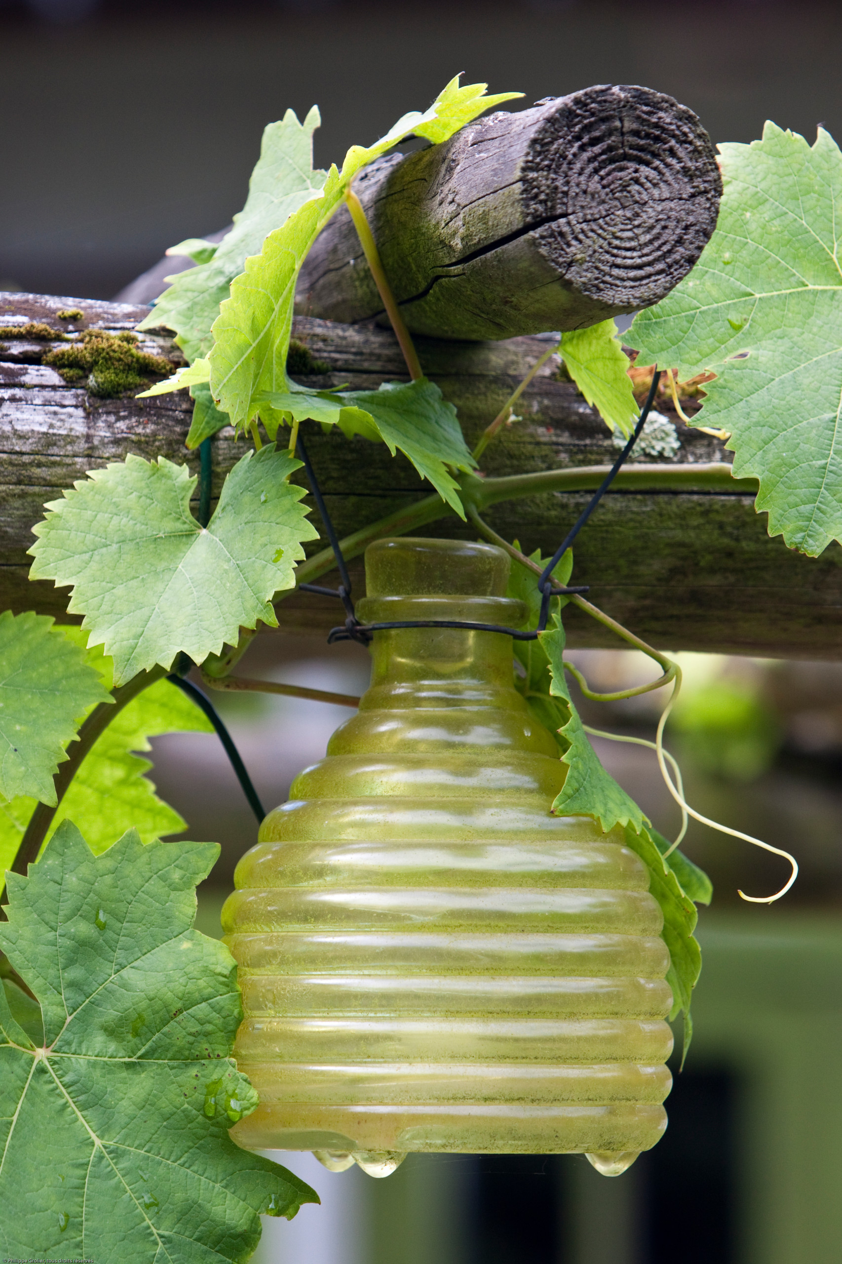 Im sonnigen Hofgarten, der vor Blumen und süßen Früchten wie diesem Wein nur so strotzt, fühlen sich nicht nur Menschen wohl. Es kann schon mal passieren, dass die Insekten ein wenig lästig werden, besonders während des Essens. Deshalb hat Deferme traditionelle Glasfallen verteilt, die allzu neugierige Wespen und andere kleine Störenfriede vom Tisch weglocken sollen.