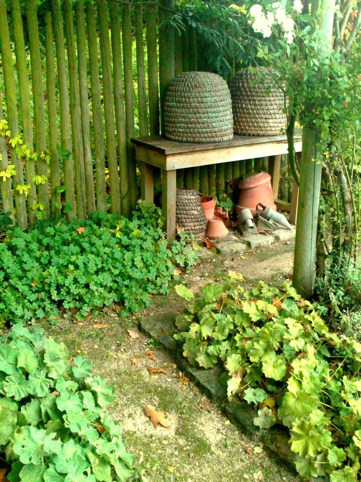 Die drei alten Bienenkörbe fand Deferme so schön, dass sie sie am Rande des Kräutergartens platzierte, wo sie außerdem gut vor Regen geschützt sind.