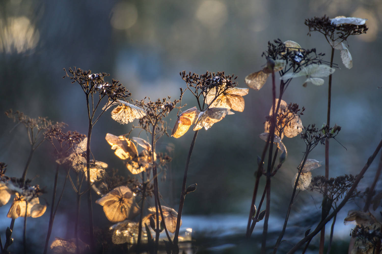 Die durchscheinenden Blätterreste der Hortensie gleichen zerknittertem Papier und bezaubern durch ihre zarte Textur. De Vries weiß um diesen Effekt und setzt ihn bewusst ein.