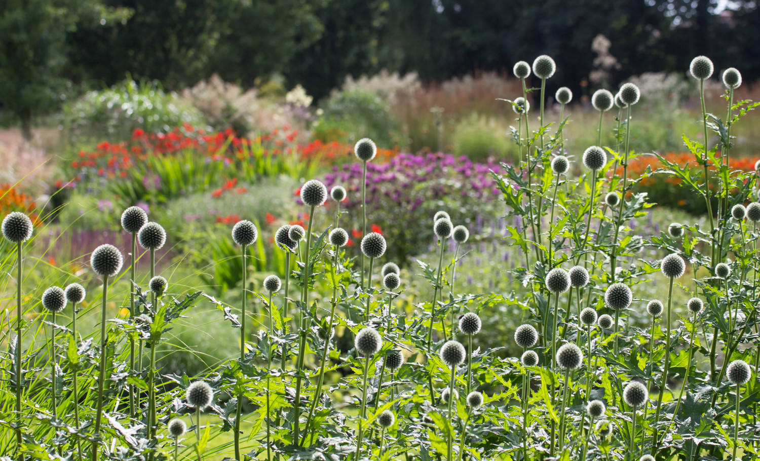 Die ersten Disteln, über drei Meter hoch, sind Echinops sphaerocephalus, Drüsenblättrige Kugeldisteln. Sie ragen hoch über die anderen Blumen hinaus. Ihr Vorkommen ist in der Pflanzenwelt eher selten, und sie eignen sich perfekt für individuelle Gärten.