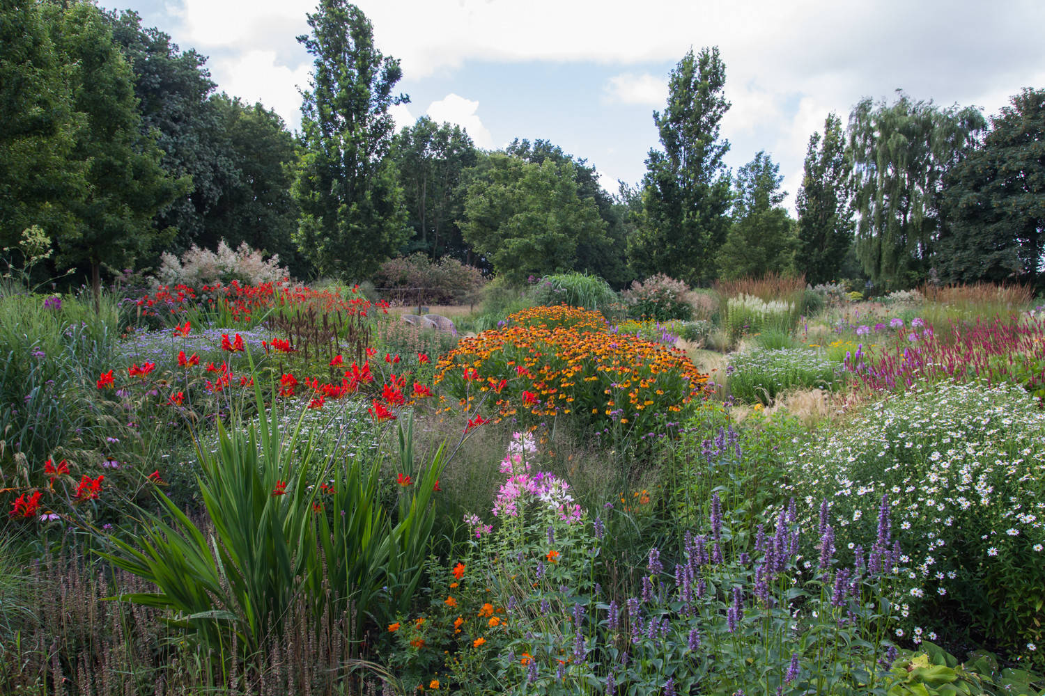 Pyramidenpappeln sind hier die einzigen großen Bäume und dienen als Umfriedung des Gartens. Sie bilden einen hohen, grünen Rahmen um De Vries’ Oase der Blumen – mit den schillernden Farben der hohen roten Montbretien (Crocosmia) und den Dickichten an Sonnenbräuten (Helenium) – in einer Gegend, in der sich Fuchs und Hase gute Nacht sagen.