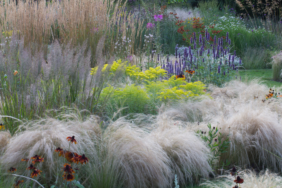 Nun nimmt alles eine ganz andere Dimension an. Das Zarte Federgras (Nasella tenuissima /Stipa tenuissima) ist eine drollig aussehende Sorte, die an Wattebäusche erinnert und im ganzen Garten verstreut wächst.