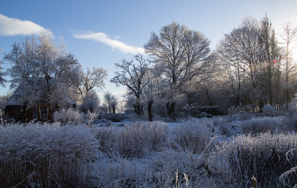 Große Bäume umsäumen das Gartenhäuschen und schützen es vor dem Wind, der von der Nordsee her weht und stürmisch und eiskalt sein kann. Zusammen mit den langen Stielen der Gräser, die stehengeblieben sind, sorgen sie für eine romantische Atmosphäre. Im niederländischen Winter ist das Licht eher fahl und die Tage sind kurz. Am frühen Morgen herrscht in dieser Region strenge Kälte und Frost.
