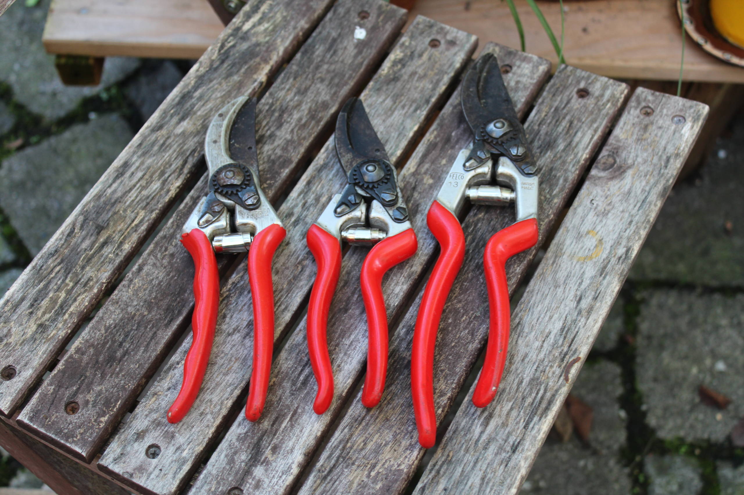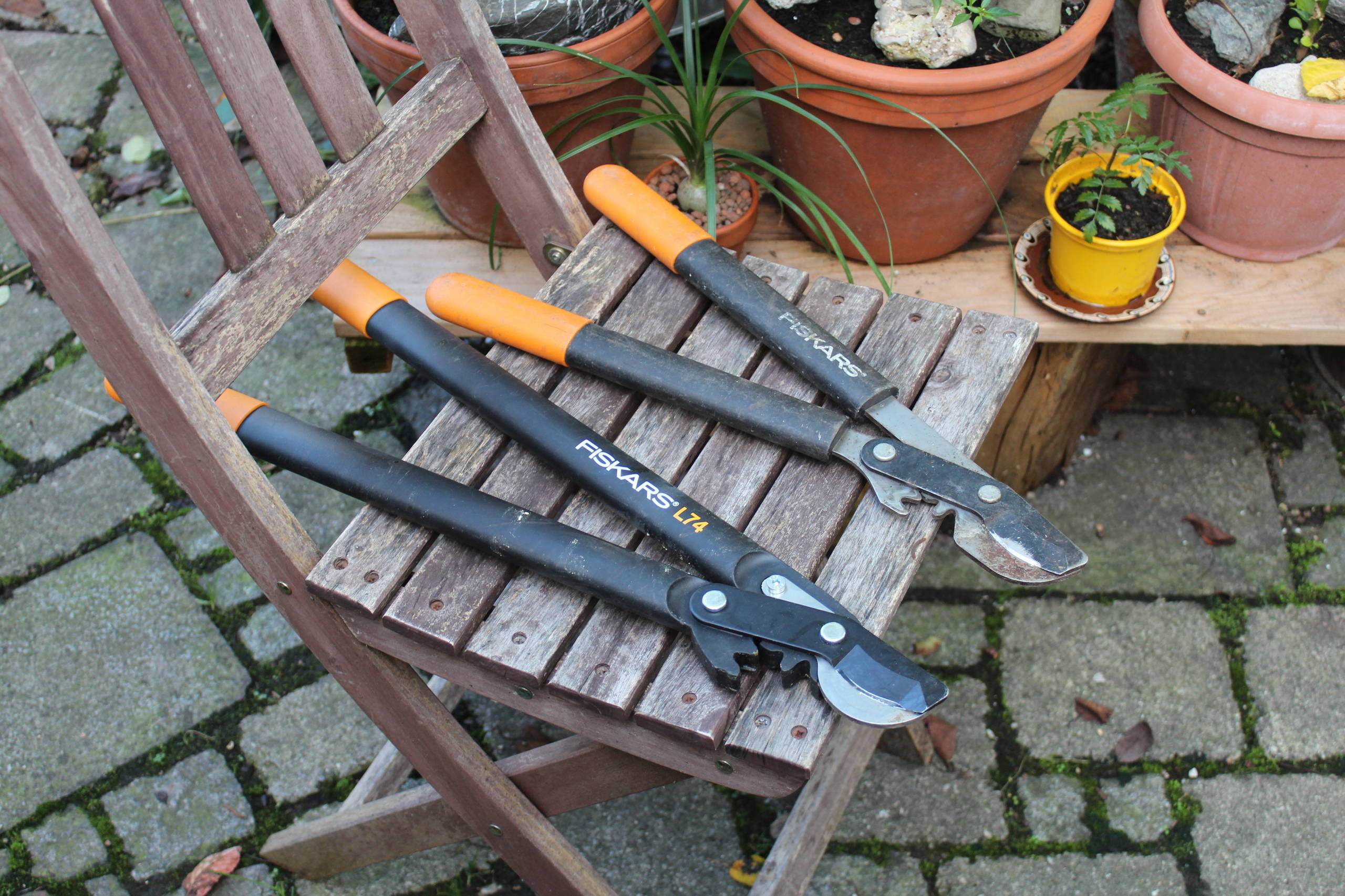 Ich benutze zwei Astscheren des schwedischen Herstellers Fiskars in unterschiedlichen Größen. Sie sind leicht, dabei aber sehr robust. Durch die auffälligen orangefarbenen Griffe findet man sie im Garten auch gut wieder.