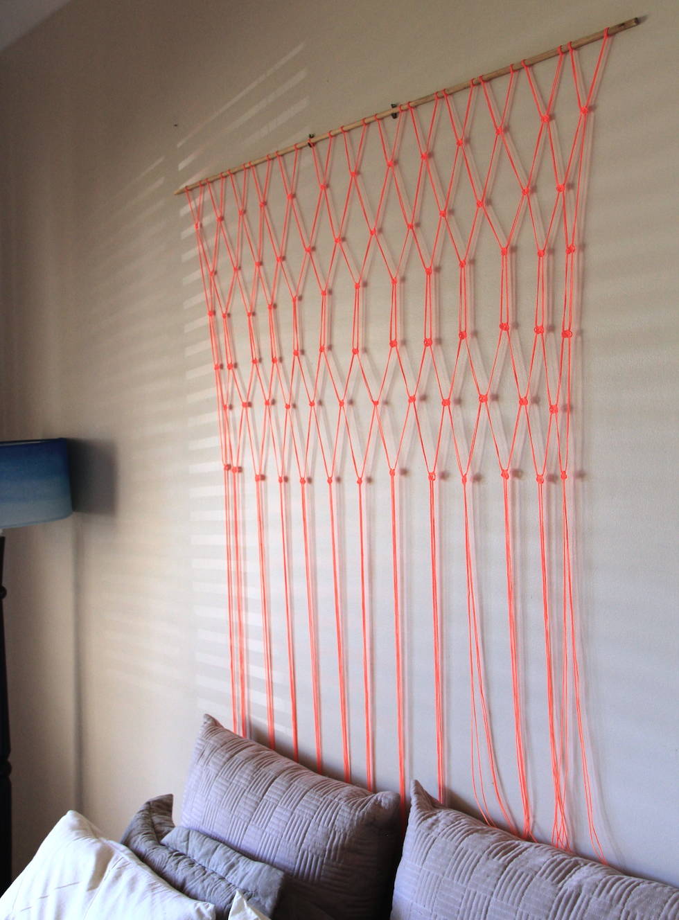 Zart, verspielt und leicht kommt dieser Makramee-Wandbehang am Kopfende des Bettes daher. Die simpel verknüpften Schnüre in Neonpink wirken grafisch und modern.