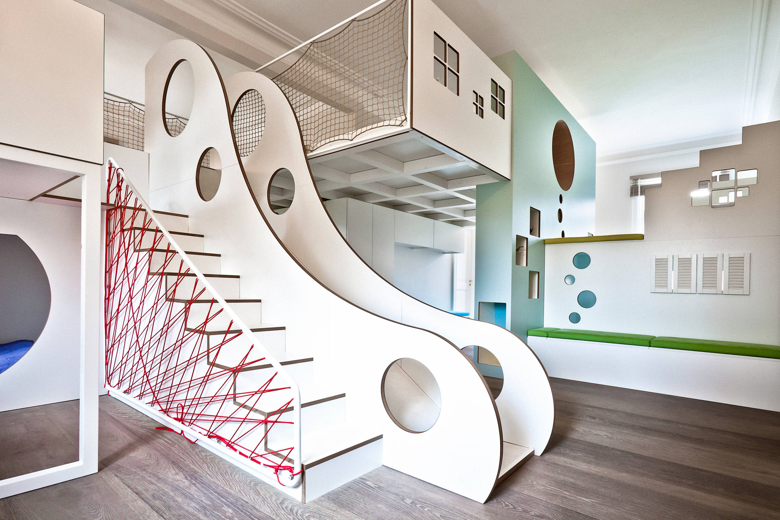 Auch in diesem Hamburger Kinderzimmer, gestaltet von Snoeck & Co, wird ein herkömmliches Treppengeländer durch ein rotes Seilnetz ersetzt – und betont so den spielerischen Charakter der aufwändigen Einbauten mit mehreren Ebenen zum Spielen und Schlafen.