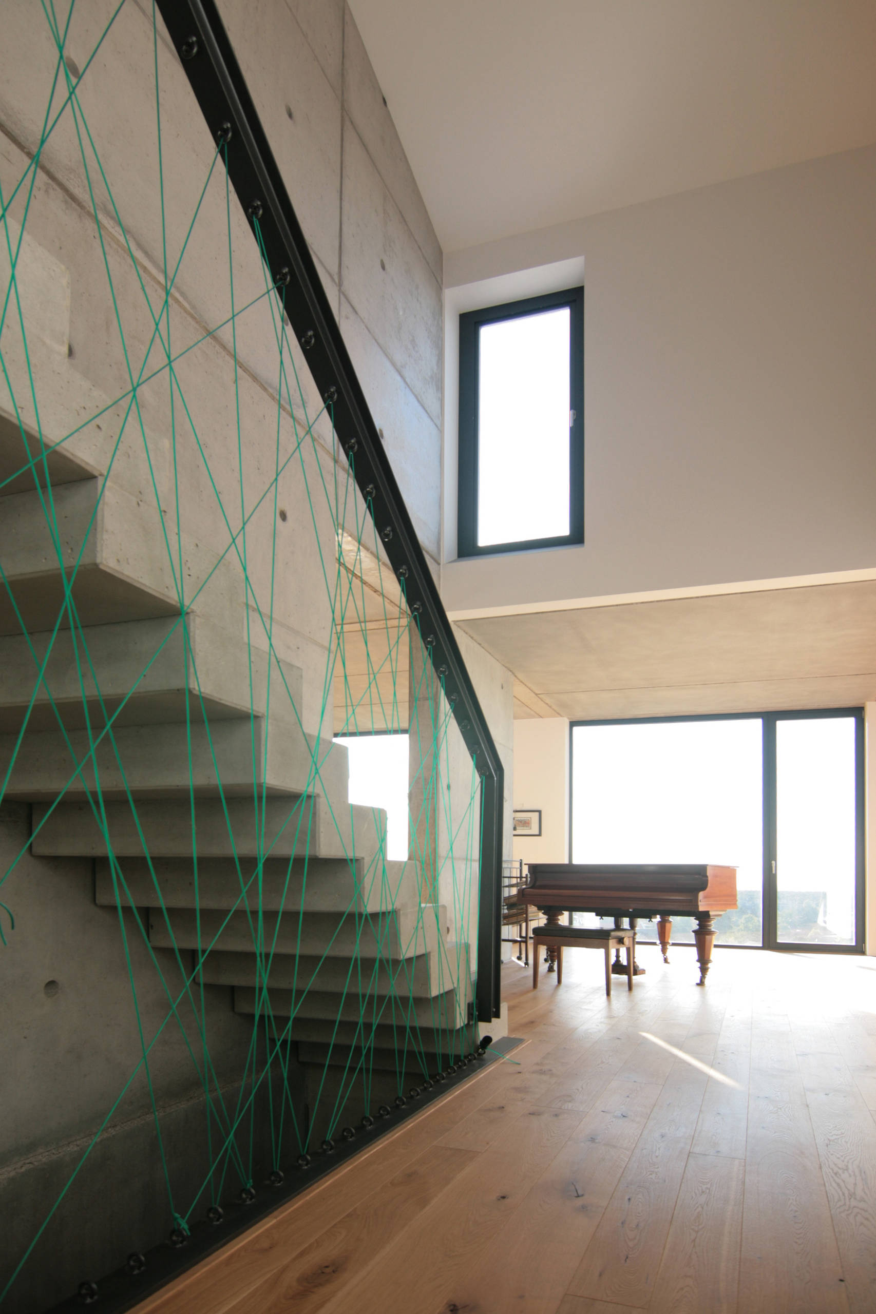 Als Treppenbrüstung spannten Mo+ Architekten hier ein Netz aus türkisfarbenen Seilen. Der ungewöhnliche Sturzschutz verleiht der Wohnung eine künstlerische und leichte Atmosphäre; die zarte Linienführung lockert die Schwere der Betontreppe auf.