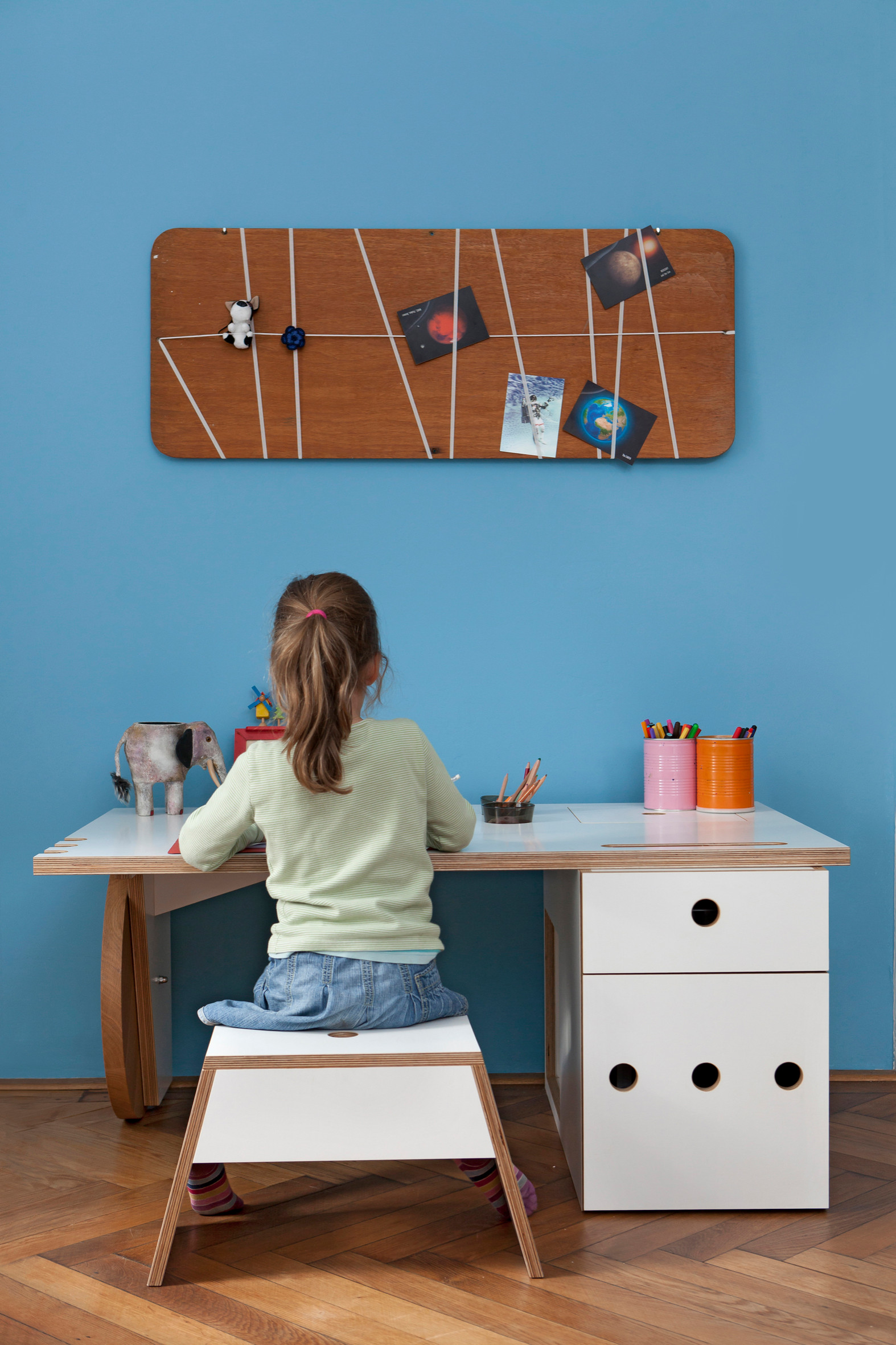 Ein Holzbrett, ein paar Schnüre kreuz und quer darübergespannt – schon hat man eine kreative und praktische Alltagshilfe, denn hinter die gespannten Schnüre kann man Flyer, Fotos oder Notizen klemmen. Dieses Exemplar gehört zur Campini Kindermöbel-Kollektion von Duelli Klee Innenarchitektur aus München.