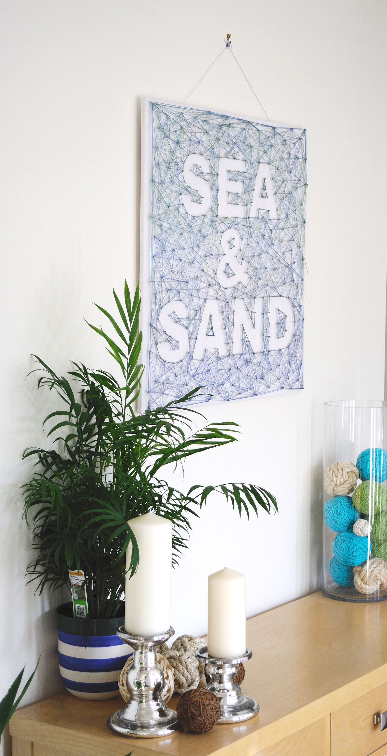 DIY-lerin Zoe Feast aus Illinois hat mit dünnen Fäden ein aufwändigeres Kunstwerk geschaffen. Die Basis bietet eine Leinwand, in die kleine Nägel geschlagen wurden – und zwar so, dass der Schriftzug „Sea & Sand“ frei bleibt. Um diese Nägel wickelte Feast dann kreuz und quer blaue und grüne Baumwollfäden.