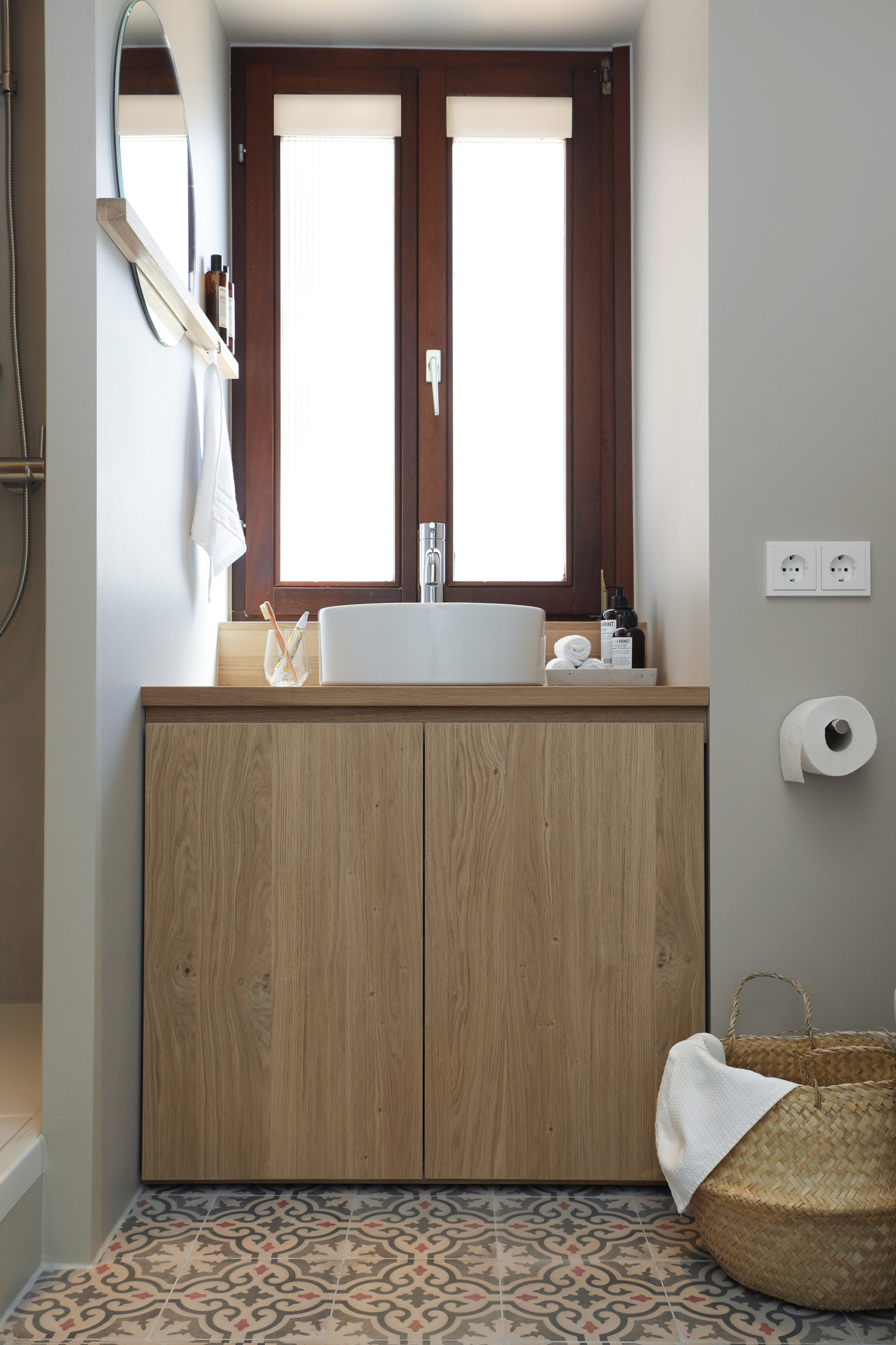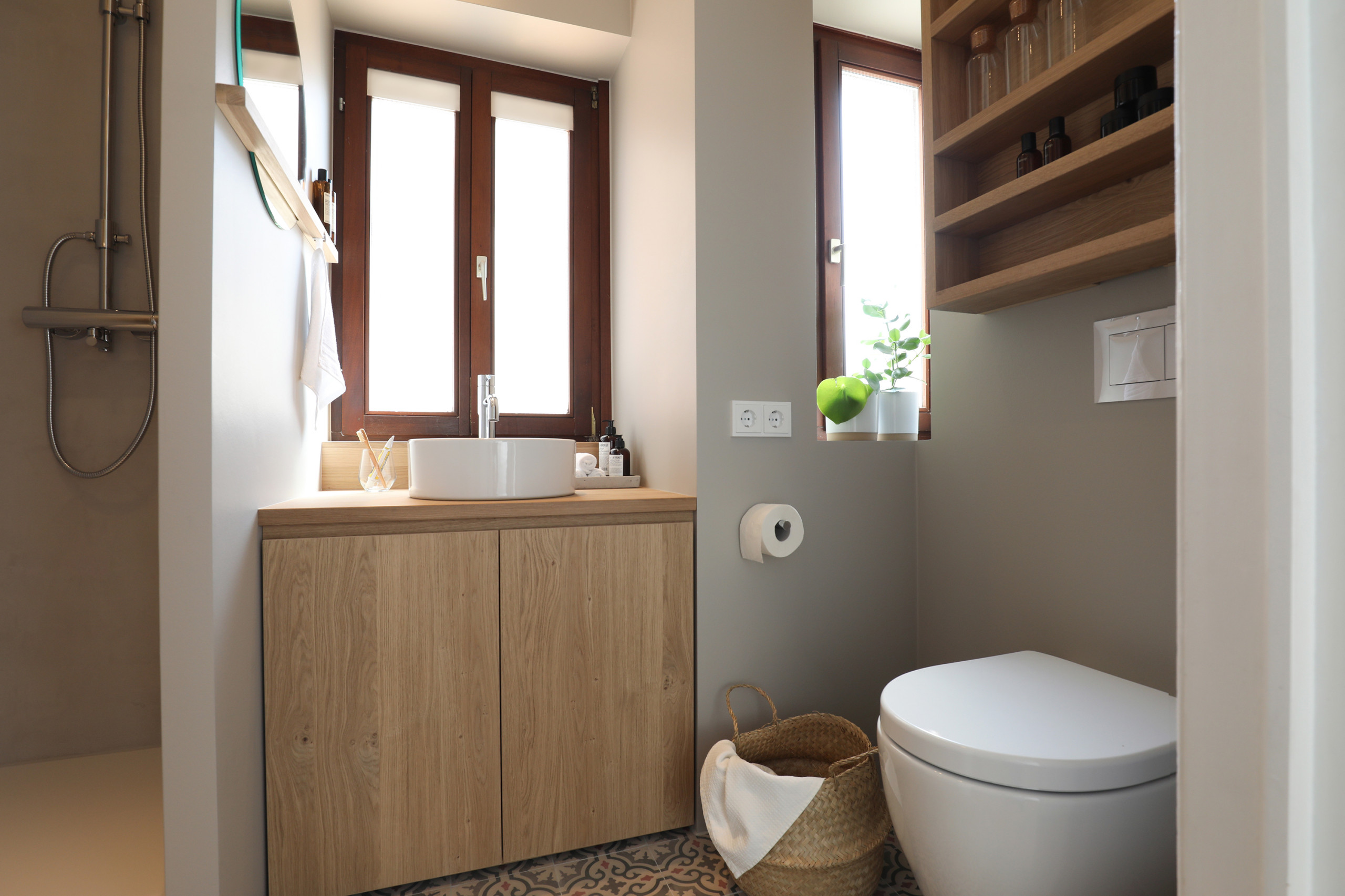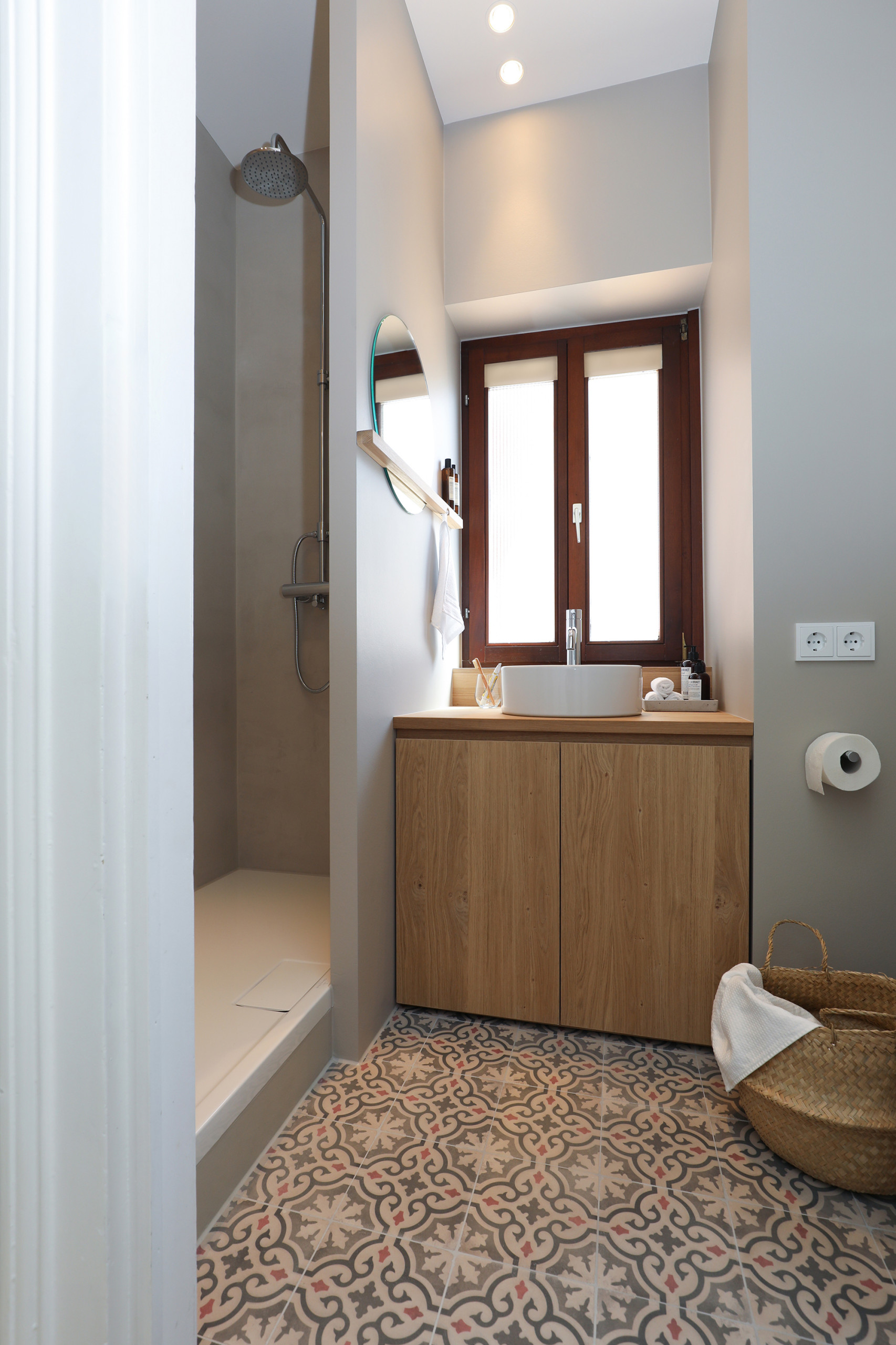Die neue Dusche ist leicht erhöht und sozusagen um die Ecke. Die Abtrennung durch eine Wand verschwendet keinen Platz: Neben der Unterbringung des Spiegels, kann der Waschtisch hier einfach an die Duschwand angrenzen und schmiegt sich harmonisch in die Nische vor dem Fenster.