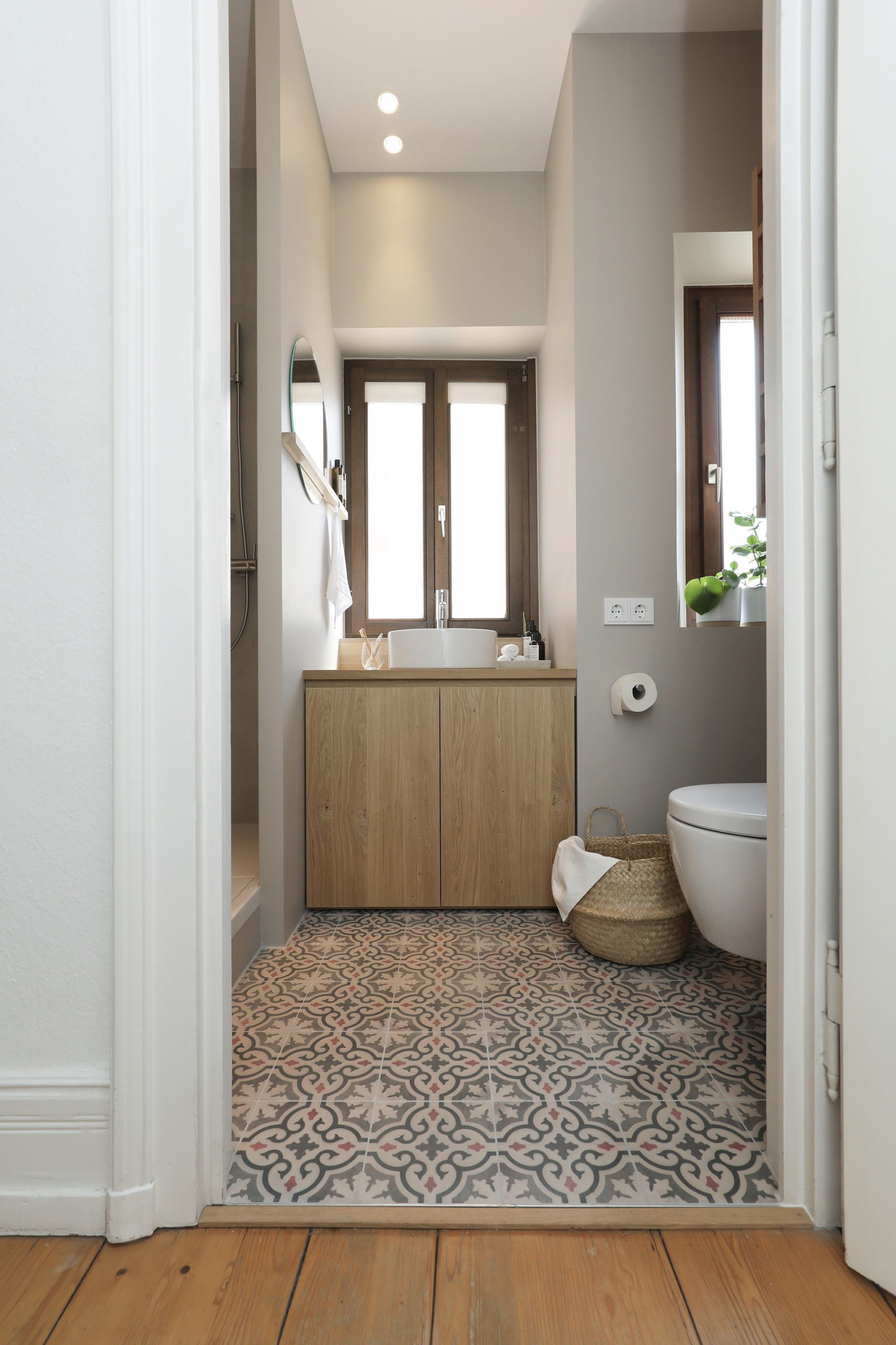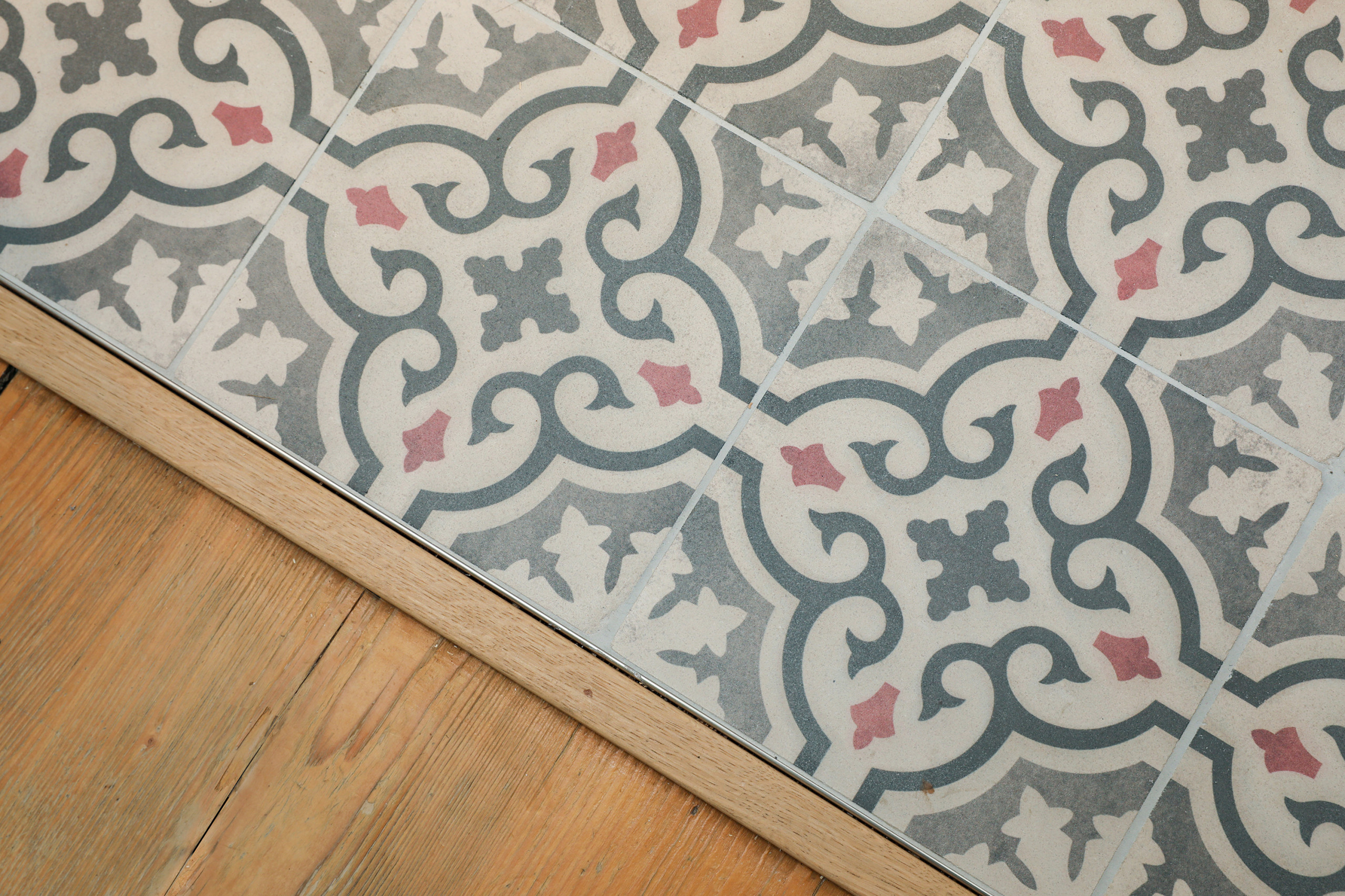 Bei der Auswahl des Bodenbelags legte die Auftraggeberin besonderen Wert auf ein stimmiges Gesamtbild in der Wohnung. So orientieren sich die neuen Zementfliesen in Farbe und Design an den Originalfliesen im Bestand der Küche. Dank einer Sonderanfertigung passen die Fliesen nun perfekt dazu und sehen dabei auch noch fabelhaft aus.