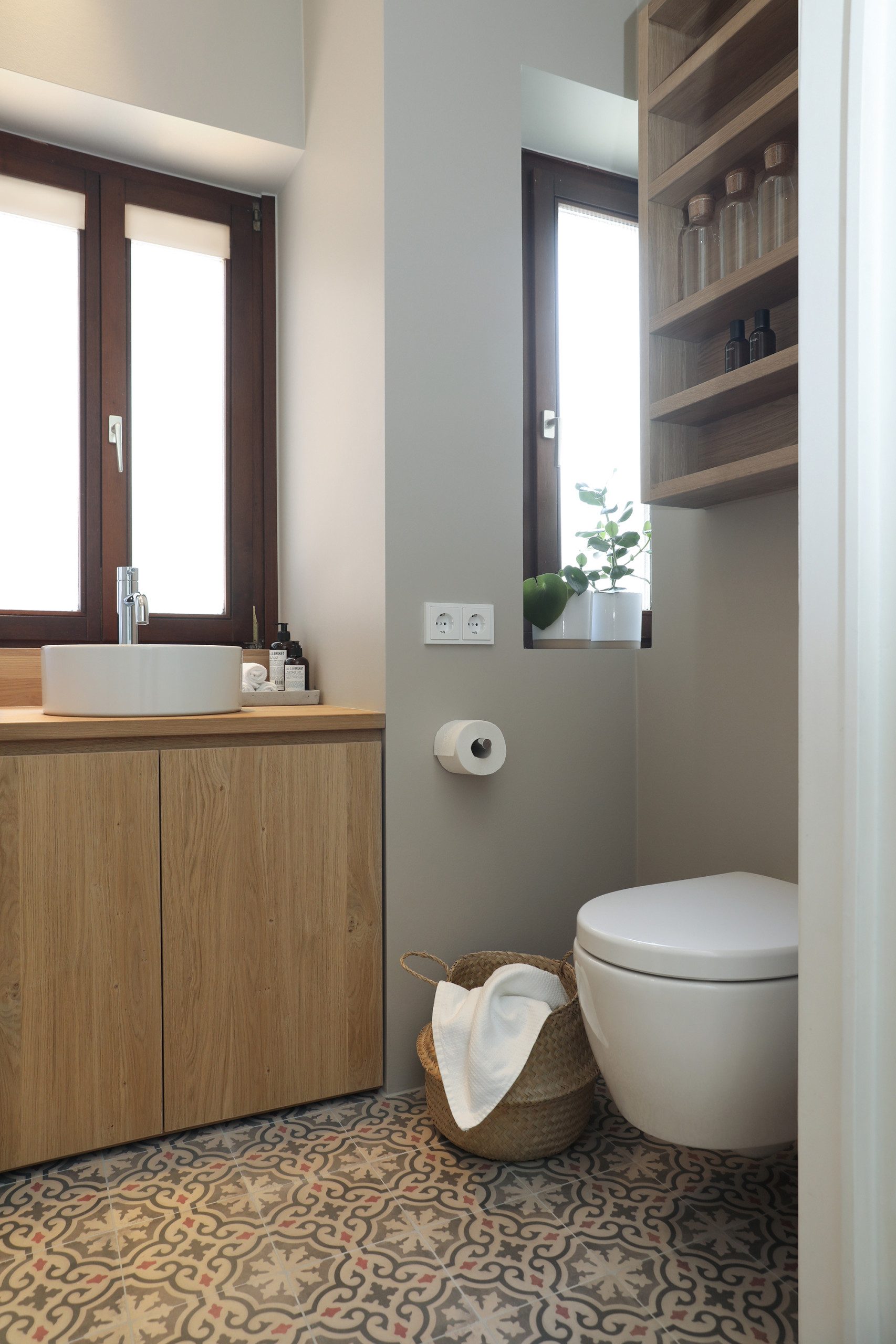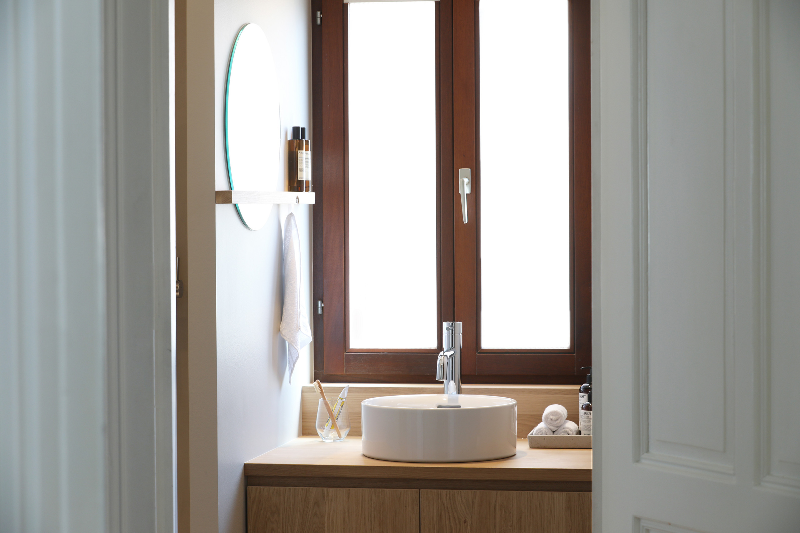 Wegen des Fensters fand der obligatorische Spiegel seinen Platz nicht wie üblich über dem Waschbecken, sondern links daneben. Und auch insgesamt ist die Anordnung der verschiedenen Elemente maßgeblich von dem engen Raum bestimmt und zeugt von einem kreativen Umgang mit den Begebenheiten.
