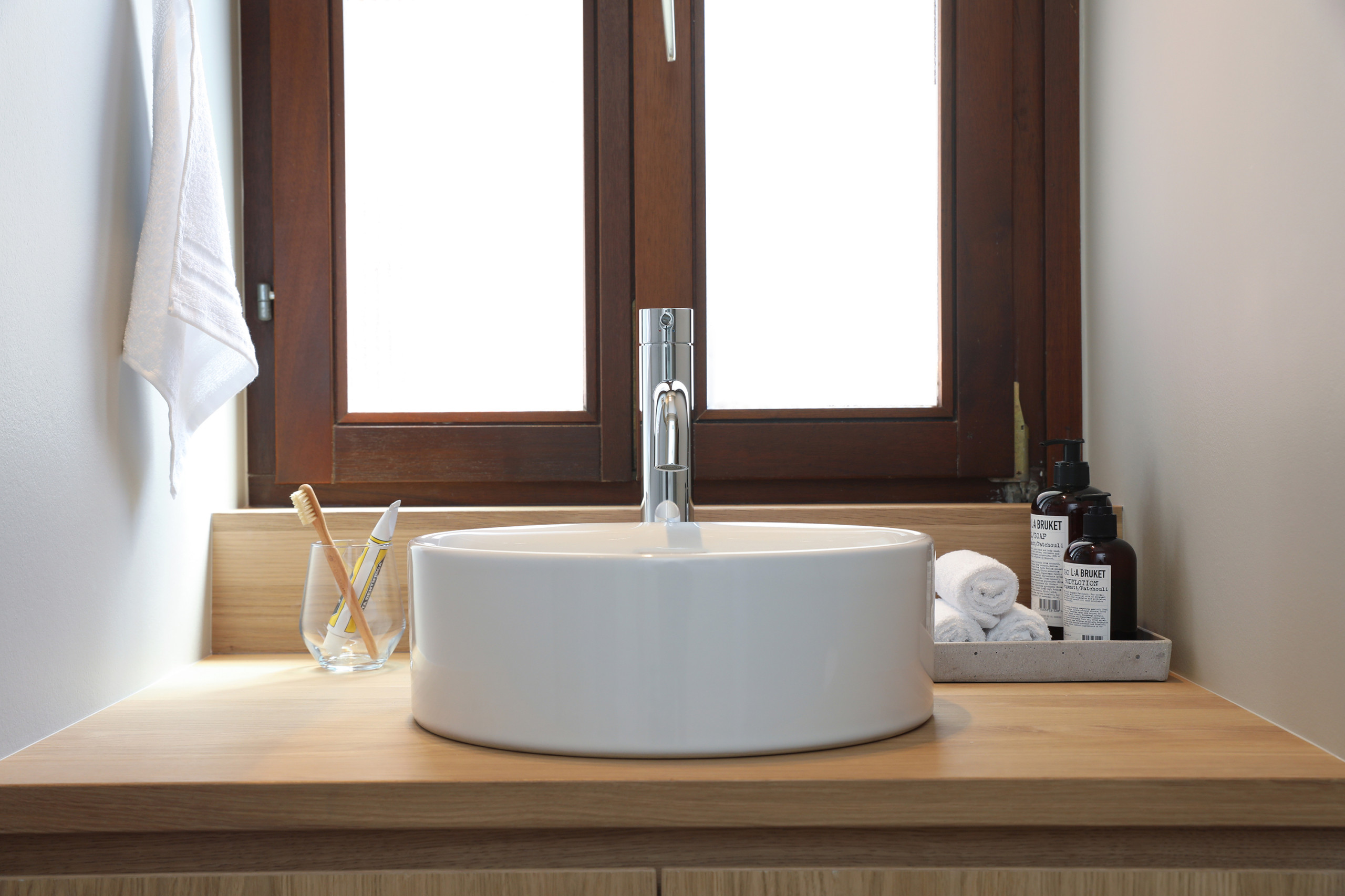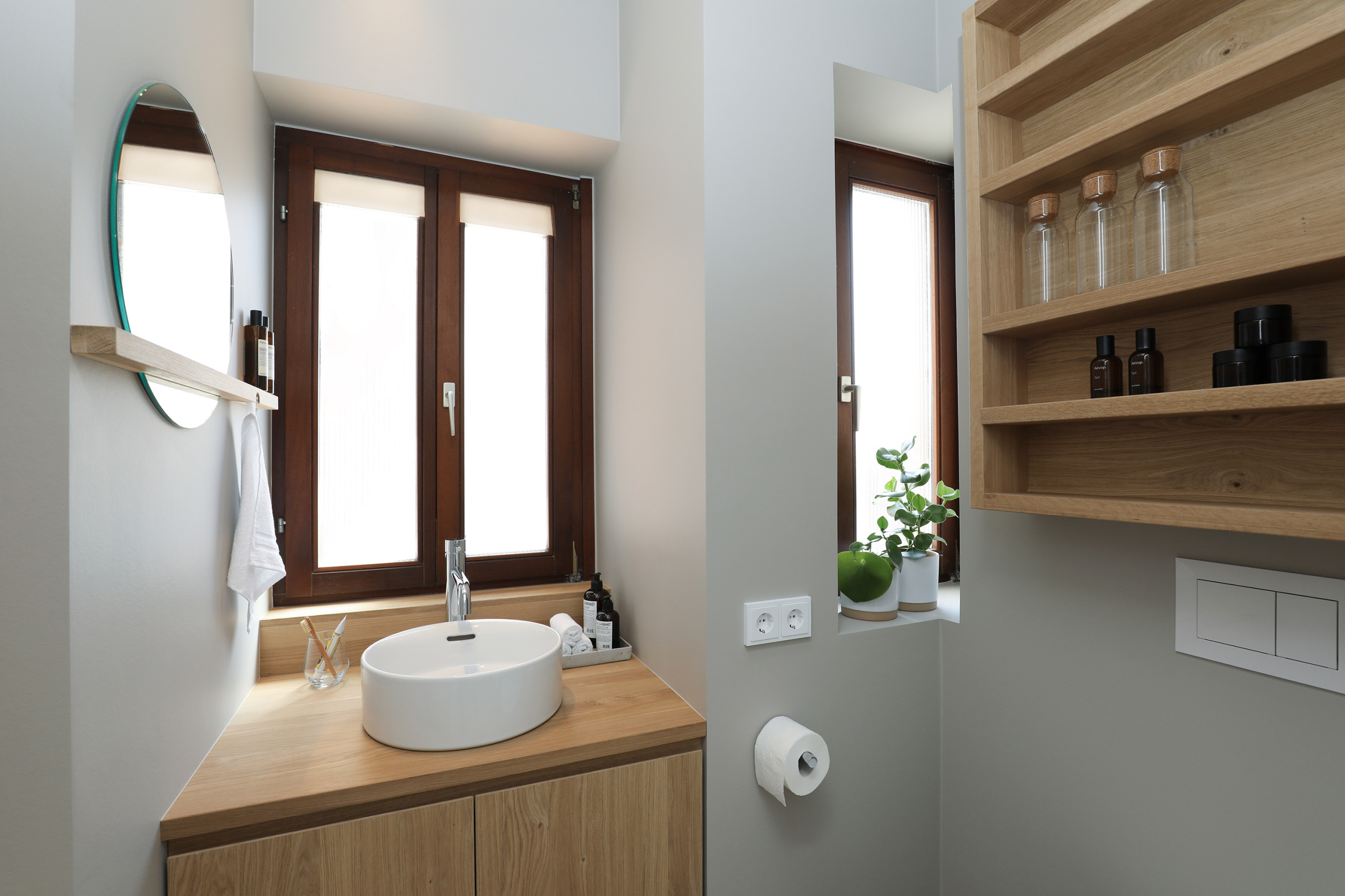 Einklang. Einige Jahre zuvor hatte Eva Lorey die Neugestaltung der Küche übernommen und war so mit dem Objekt bereits vertraut. Die Auftraggeberin wünschte sich eine moderne Gestaltung, die gleichzeitig Bezug auf den Bestand nimmt. Die Farbtöne der Küche sollten sich in dem neuen Badezimmer wiederfinden. In Anlehnung an die Dielen im Flur sollten Holzelemente aus massiver Eiche und Eichenfurnier dem Raum zusätzliche Wärme verleihen.