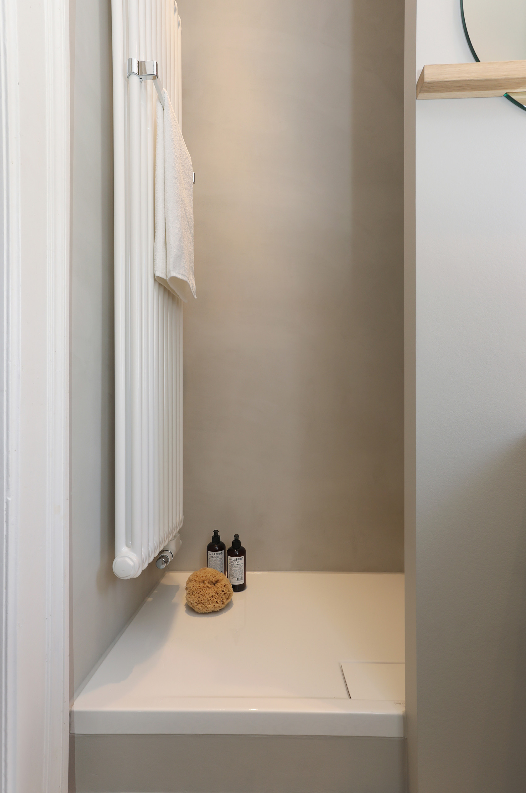Röhrenheizkörper von Zehnder, „Charleston“, Spachtelung in der Dusche von Edel & Stein, „Cara Compenso“ (versiegelt für den Nassbereich)