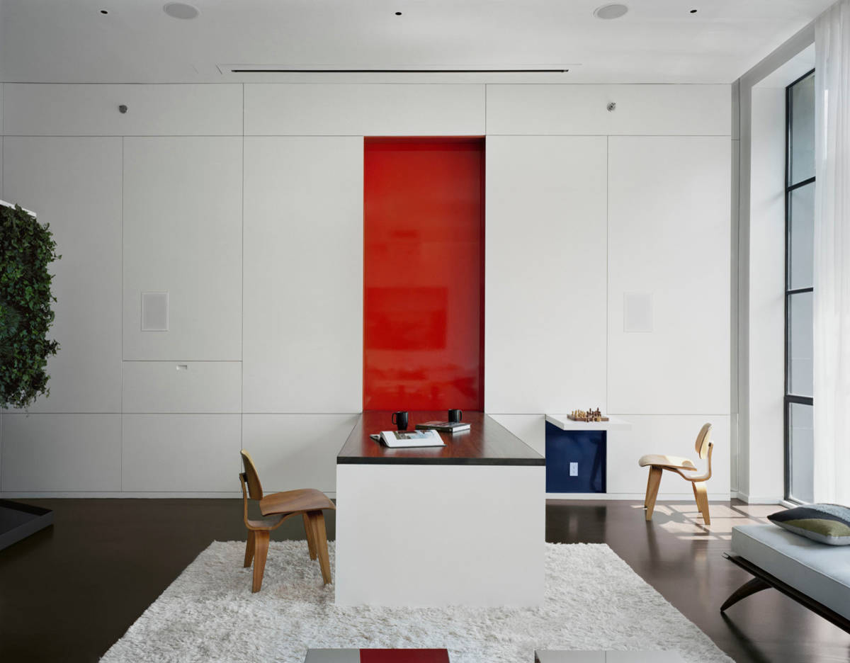 Eine Hommage an Mondrian kann aber durchaus dezenter ausfallen. In diesem Bad von Homeology Design aus London sind es die schwarzen Linien, die erst durch Details in Grundfarben mondrianesk werden; im Arbeitszimmer oben die farbig gefassten Nischen, die dem Raum einen Rhythmus geben.