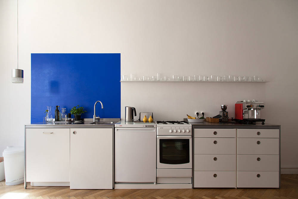 Und selbst ein einzelnes yves-klein-blaues Quadrat, unten in einer Berliner Küche von Jana Kubischik, wirkt für uns wie ein freundlicher Gruß an den großen Niederländer.