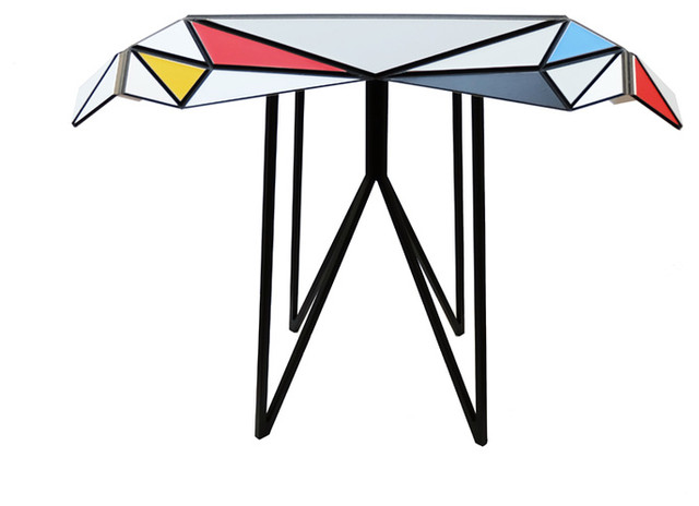 Ebenfalls von Mondrian inspirieren ließ sich der belgische Designer Patrick Beyaert. Allein, bei diesem origamiartigen Beistelltisch hätte Mondrian selbst wohl protestiert: Als sein De-Stijl-Kollege Theo van Doesburg begann, in seinem Werk mit Diagonalen zu arbeiten und nicht mehr davon abließ, trat Mondrian demonstrativ aus der Gruppe aus.