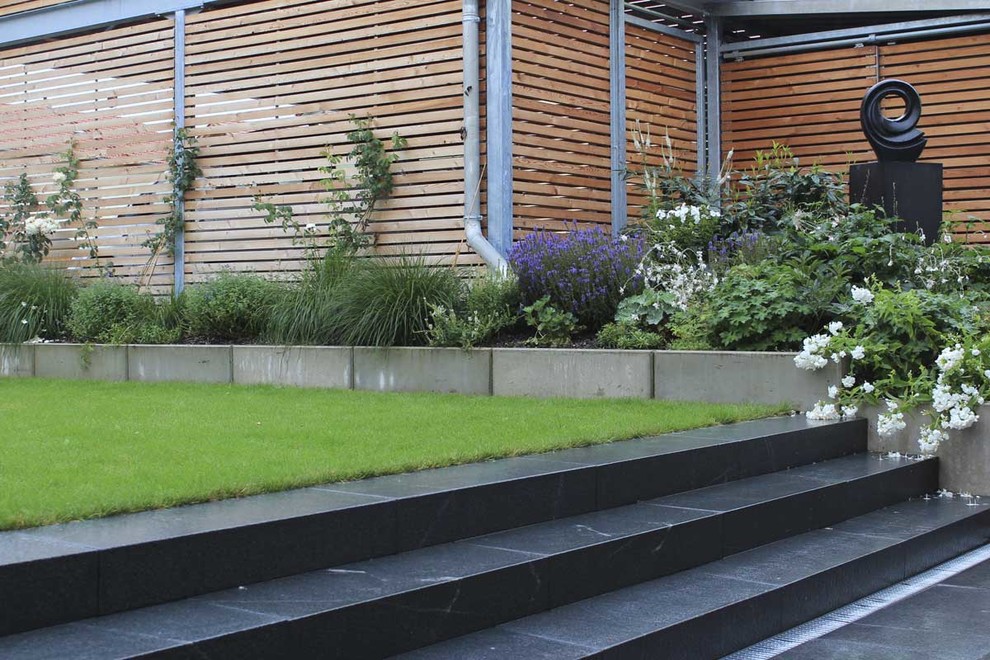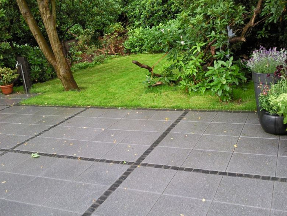 Ein Raster aus dunklem Basalt durchzieht in diesem Projekt von F.d.S. Garten- und Landschaftsbau die graue Betonstein-Fläche.
