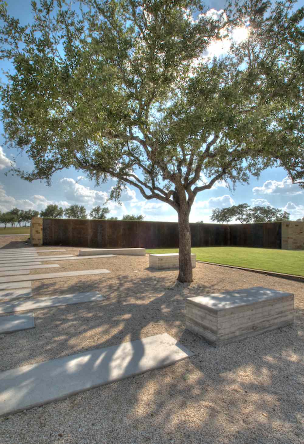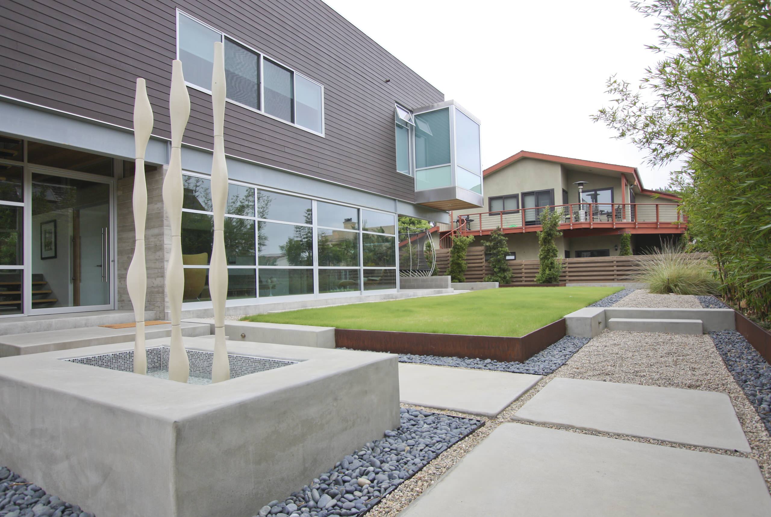 Mann kann aber auch andere Materialien zu Beton kombinieren. In diesem Garten von Grounded in Kalifornien sieht man Beton in Kombination mit Cortenstahl, hellem Riesel und grauem Kies; Pflanzen setzen grüne Akzente – ein spannender Kontrast hinsichtlich Farbe sowie Oberfläche.