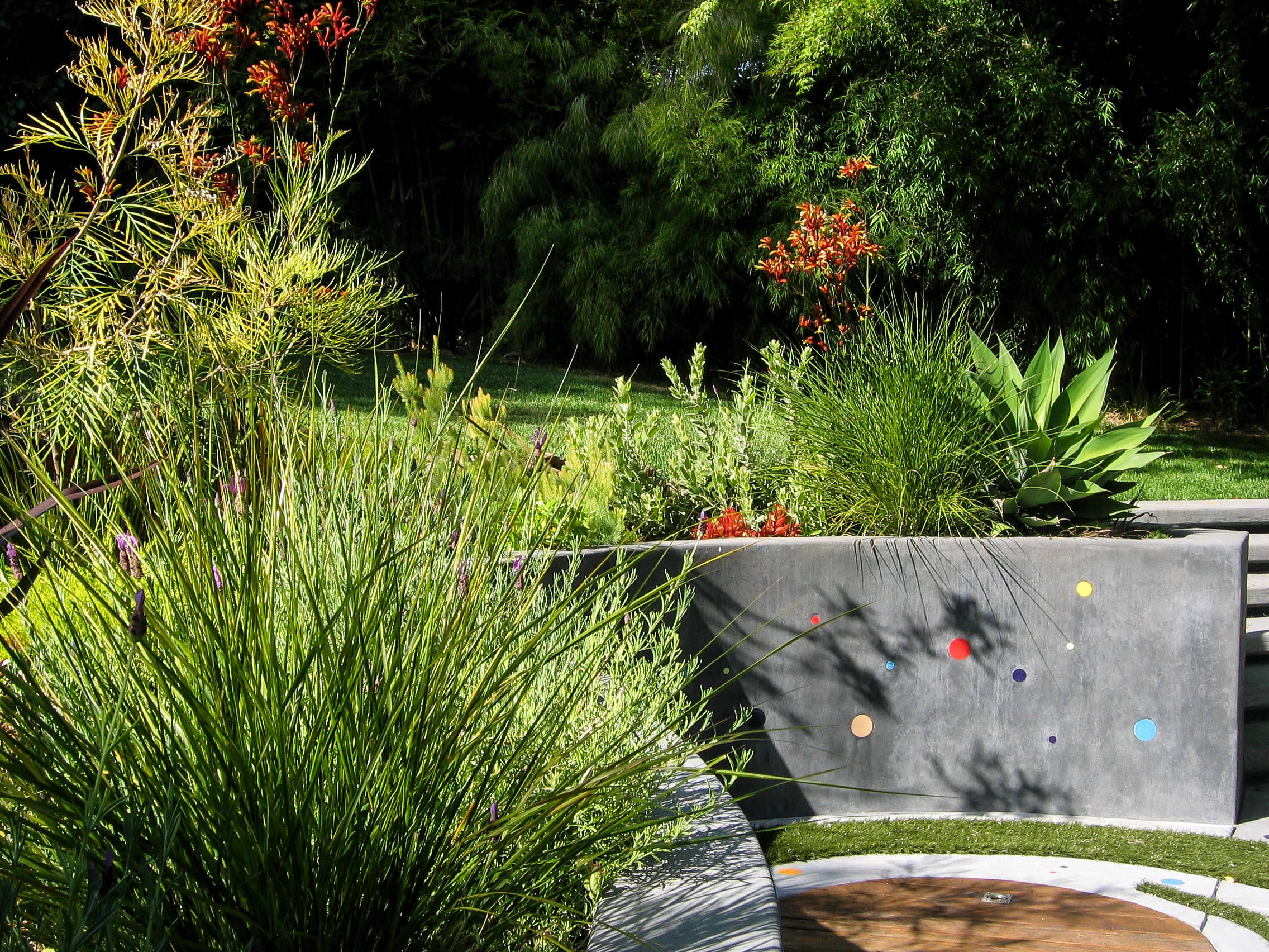 In diesem Garten von Kathleen Shaeffer dient der Beton als Leinwand für bunte Kreise.