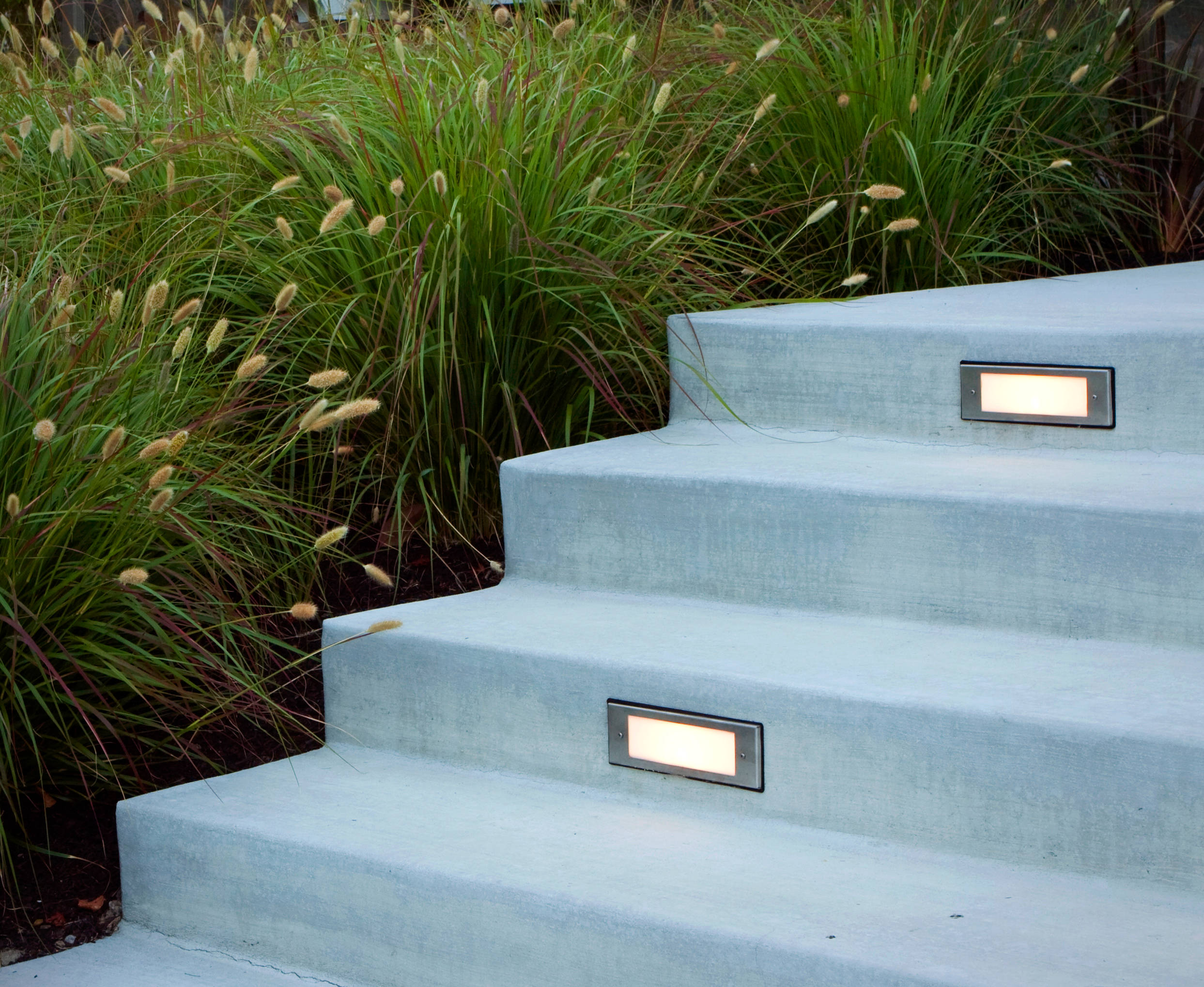 In diesem Vorgarten in den USA steht die Bepflanzung aus locker überhängenden Gräser in reizvollem Kontrast zur massiven Betontreppe. Die ist ein Fertigteil, wurde so auf die Baustelle geliefert und in den Vorgarten eingebaut. Ein ähnlicher Look lässt sich hierzulande mit dem Lampenputzer-Gras Pennisetum alopecuroides oder auch mit dem Japan-Gras Hakonechloa macra erreichen.