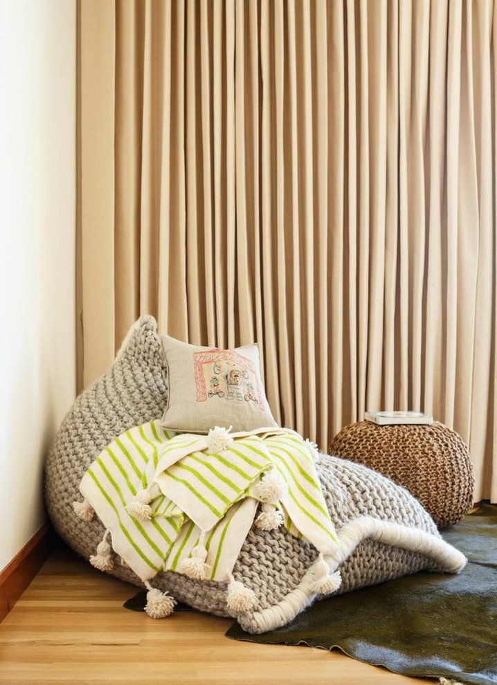 Naturbelassene Hanffasern weisen eine mittelbraune Färbung mit goldgelben Nuancen auf (wie der kleine Sitzsack im Hintergrund). Sie passen hervorragend zu anderen Naturtönen und Weiß. Gut kann man sie mit Materialien wie Wolle oder Sisal, Jute, Kokos oder Flachs kombinieren. Auch geölte Vollholzmöbel sehen zu Hanf toll aus.