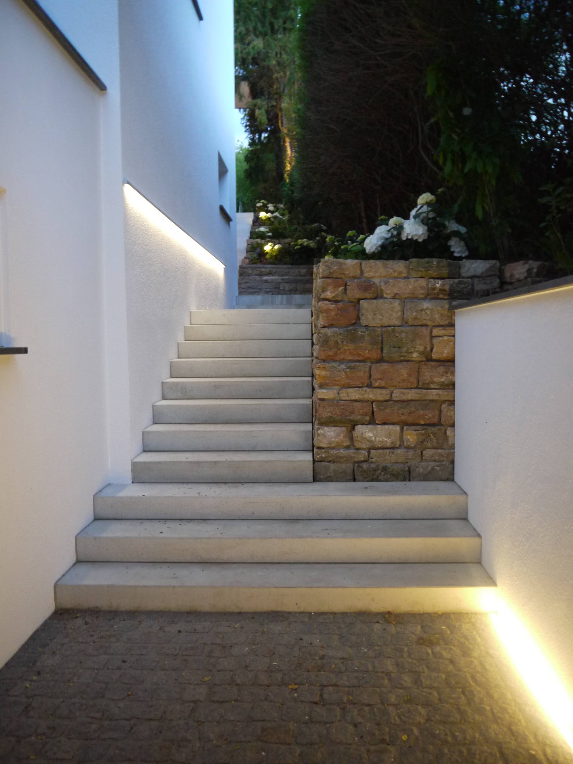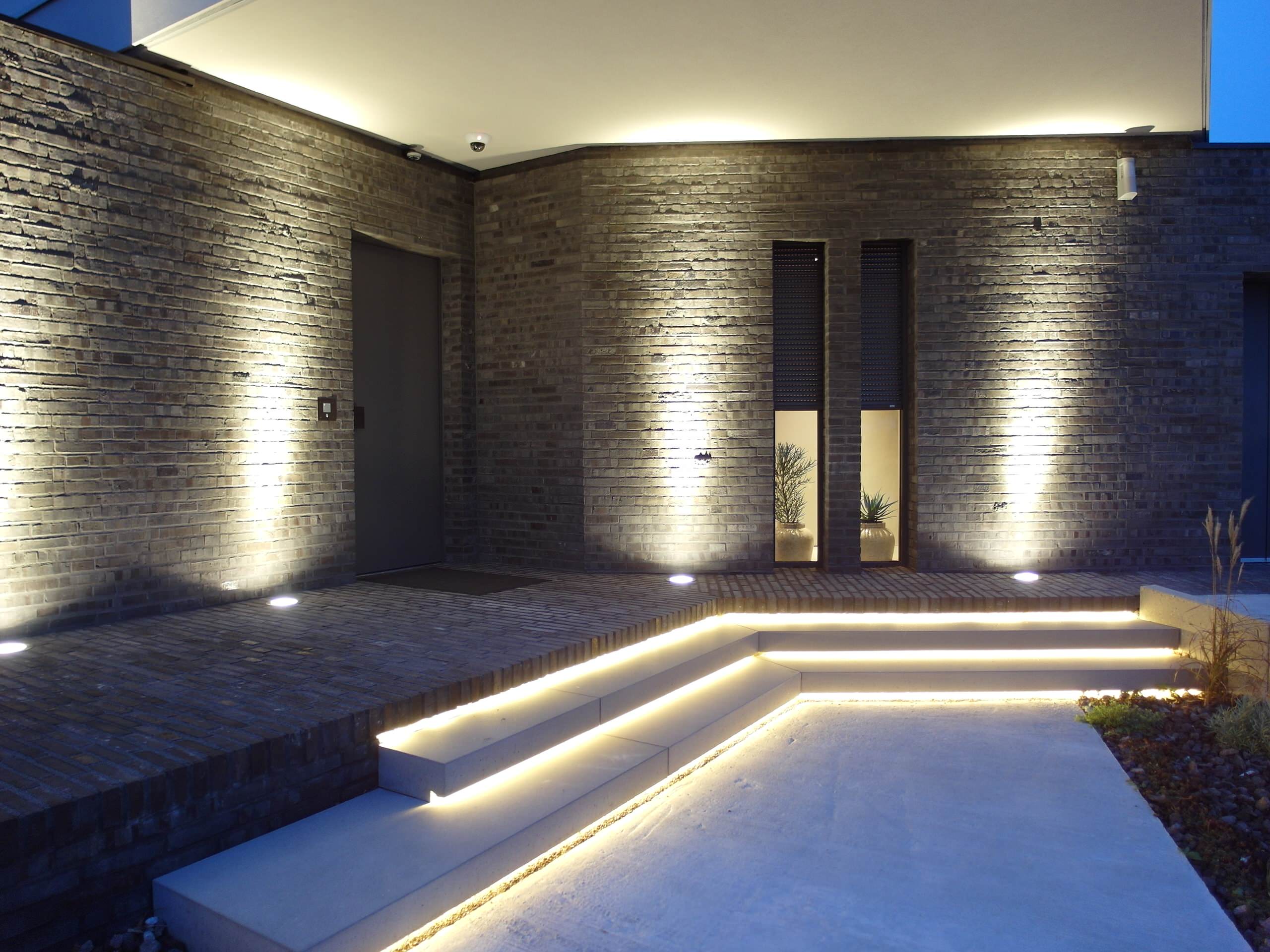 Eine weitere Variante der Treppenbeleuchtung ist die Betonung durch LED-Lichtleisten, die parallel zum Stufenbild verlaufen. Sie wirken besonders großzügig und erhöhen die Sicherheit beim Aufstieg im Dunkeln. Für den Bereich direkt vor der Haustür wurden vor diesem Haus in der Pfalz zusätzlich Bodeneinbauleuchten eingesetzt.