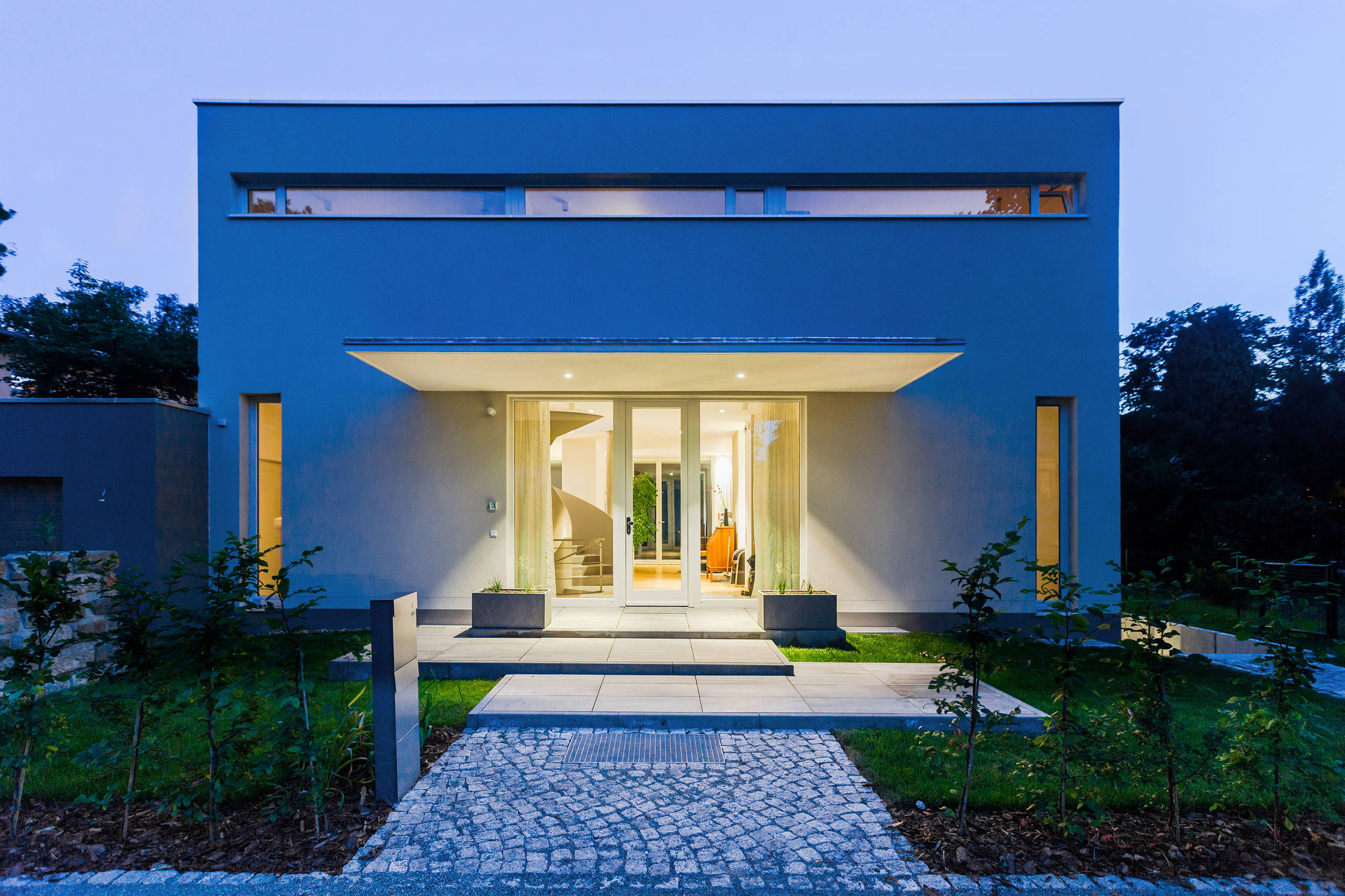 Für alle, denen es nicht zu grell sein darf – in diesem Beispiel lautet das Motto: angenehm dezent und trotzdem ausreichend. Das in die Kante des Vordaches eingelassene LED-Lichtband unterstreicht Form und Struktur der Fassade – eine gute Wahl für Gebäude mit aussagekräftiger Architektur.