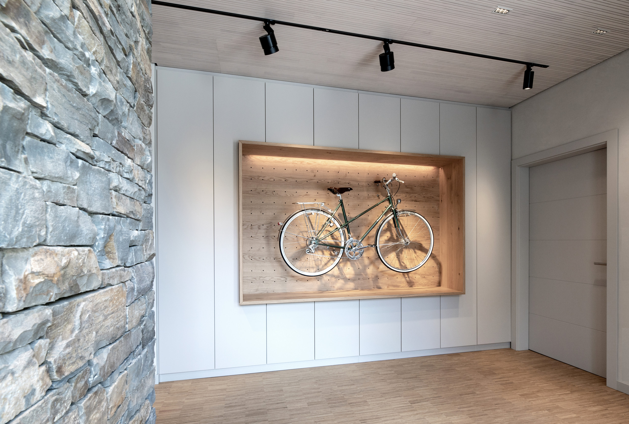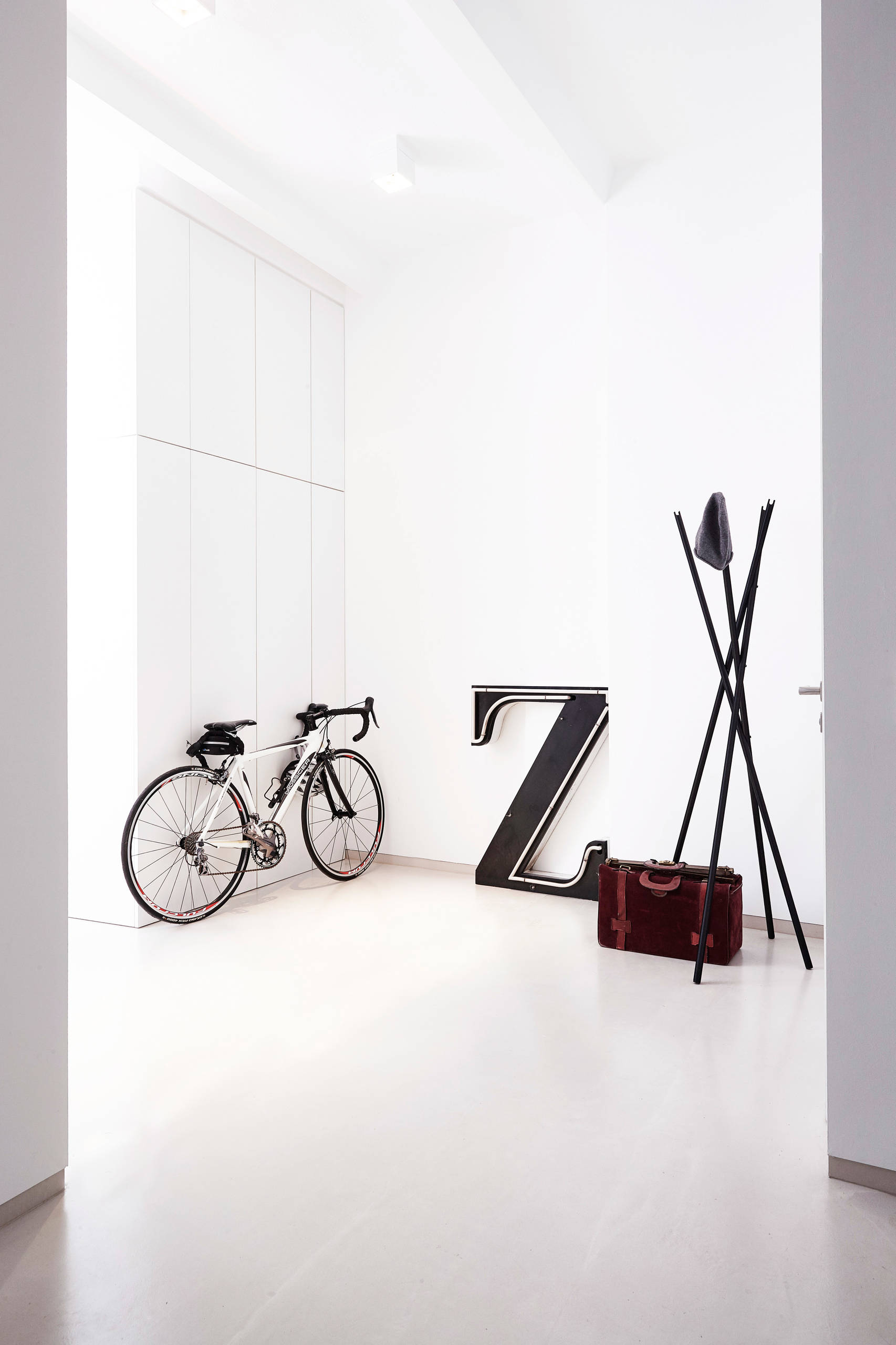 Aber den meisten geht es ja gar nicht ums Verstecken, sondern um die Inszenierung: Brüning Interiors gestalteten ein Multifunktionsmöbel für einen Eingangsbereich. Ein Fahrrad ist für Liebhaber eben mehr als die Summe seiner verchromten Bauteile.